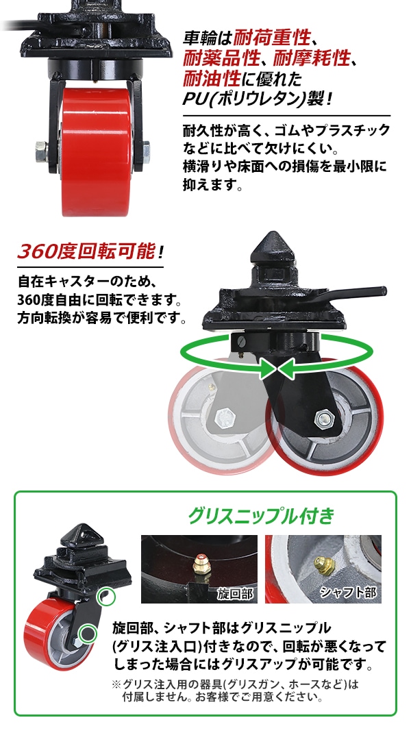 | 材質 | 粉体塗装鋳鋼(金具)、粉体塗装スチール(フォーク)、亜鉛メッキ鋳鉄(シャフト)、PU[ポリウレタン](車輪)、鋳鉄(車輪芯金) |