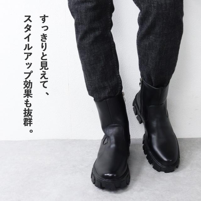 ショートブーツ メンズ 厚底 ラウンドトゥ サイドジップ 防滑 5cmヒール 25.0cm〜27.0cm 黒 ブラック No.1724 ラブハンター