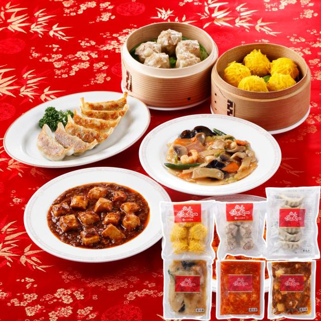 餃子6個入(120g)×1、貝柱入焼売5個入(150g)×1、錦糸焼売5個入(125g)×1、乾焼蝦仁 エビチリソース(150g)×1、本格四川麻婆豆腐(150g)×1、本格八宝菜(150g)×1