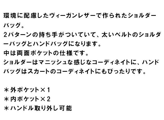 ショルダーはマニッシュな感じなコーディネイトに、ハンドバッグはスカートのコーディネイトにもぴったりです。