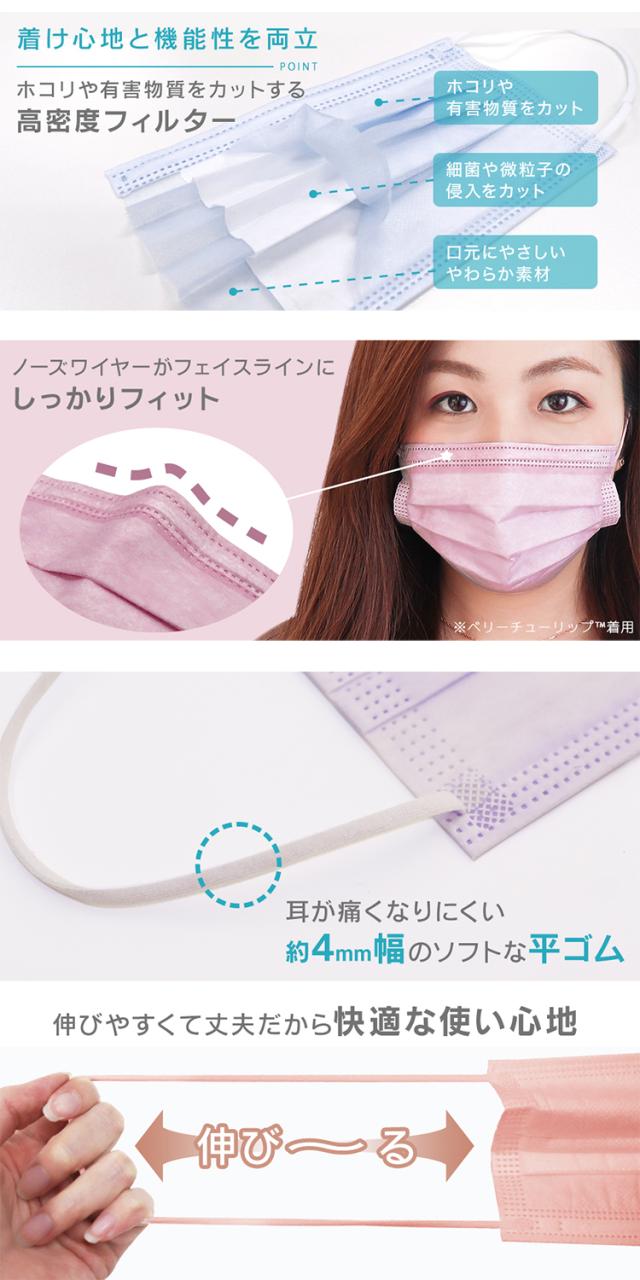 | 特徴 | 選べるカラー 99%カット高密度フィルター 特注仕様両面同色 平ゴム採用 10枚ずつ袋入り 3層構造 風邪予防 飛沫対策 花粉対策 PM2.5対策 ウイルス飛沫対策 ハウスダスト対策 |