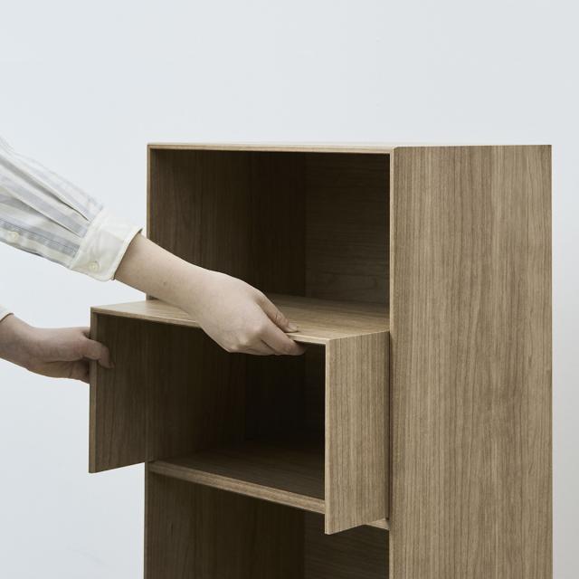 コの字棚板はボックス内寸ぴったりに作られているため、ボックスユニット本体にゆっくりと押し込むだけで設置することができます。組み立てが要らず、パーツの追加や配置換えもできるので、整理整頓や模様替えの際にも便利です。