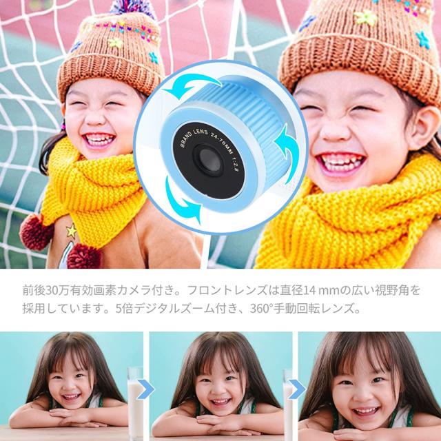 【前後30万有効画素、5倍ズーム対応】前後30万有効画素カメラ付き。フロントレンズは直径14 mmの広い視野角を採用しています。2.0インチIPSディスプレイ付きで、子供の手によりなじむデザインです。5倍デジタルズーム付き、360°手動回転レンズ。フロントとリアのデュアルレンズにより、自分撮りが簡単にできます。
