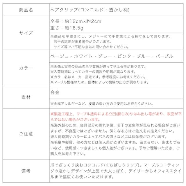 ヘアクリップ くちばしクリップ コンコルド 7カラー 透かし柄 マーブル コーム付き コンコルドクリップ ヘアクリップ グレー 白 ホワイト ベージュ ピンク 紫 大きめ レディース おしゃれ ヘアアクセサリー ビーククリップ プレゼント