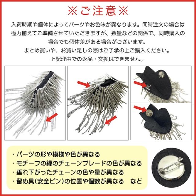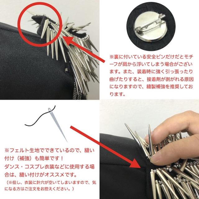 ※裏に付いている安全ピンだけだとモチーフが肩から浮いてしまう場合がございます。フェルト生地でできているので、縫い付け(補強)も簡単です!ダンス・コスプレ衣装などに使用する場合は、縫い付けがオススメです。