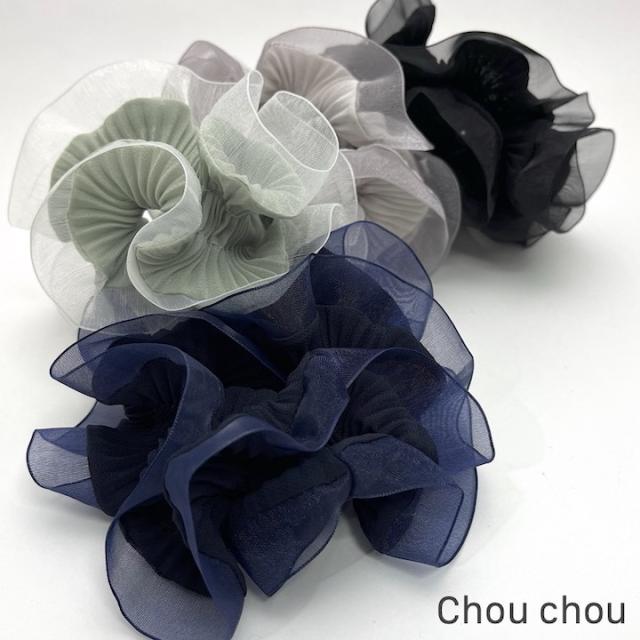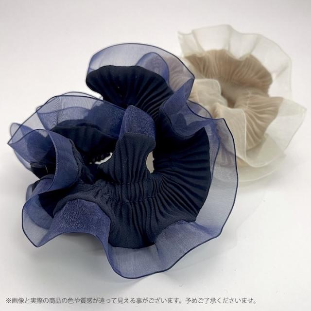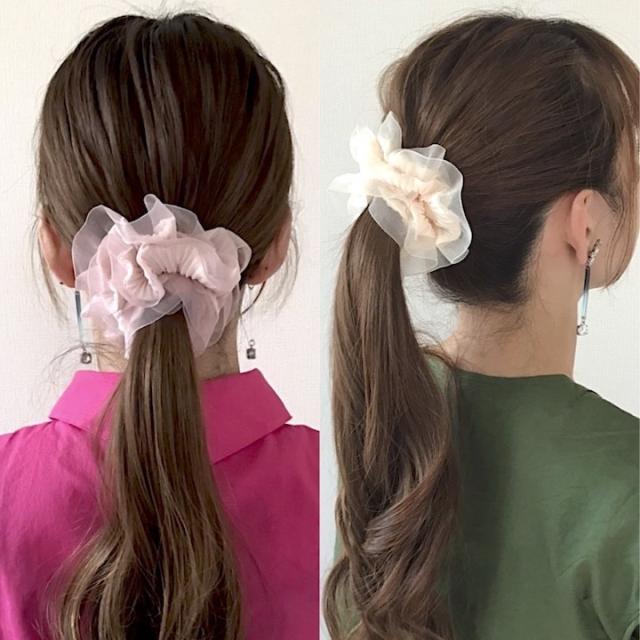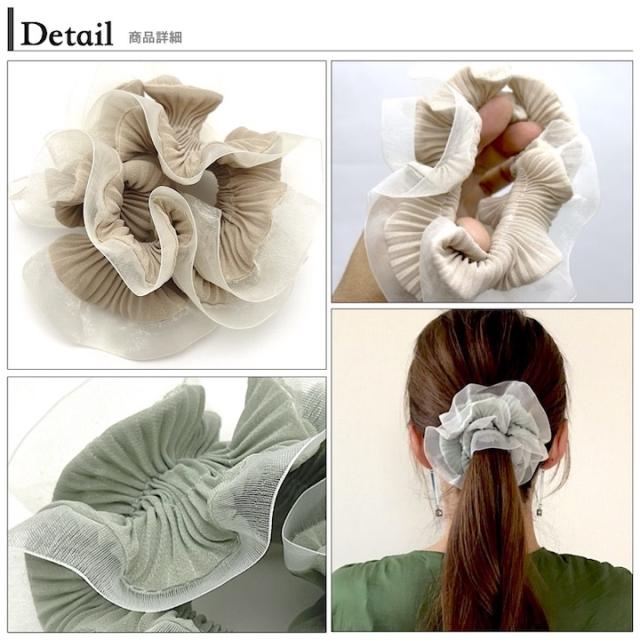 プリーツ加工が施された大人可愛いシュシュです。透け感のある縁取りがとっても爽やかで、シュシュのボリュームほど重たい見た目の印象になりません。ボリューミーなシュシュも、繊細なプリーツと透け感のある縁取りで、程よく上品に仕上がっています。