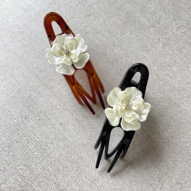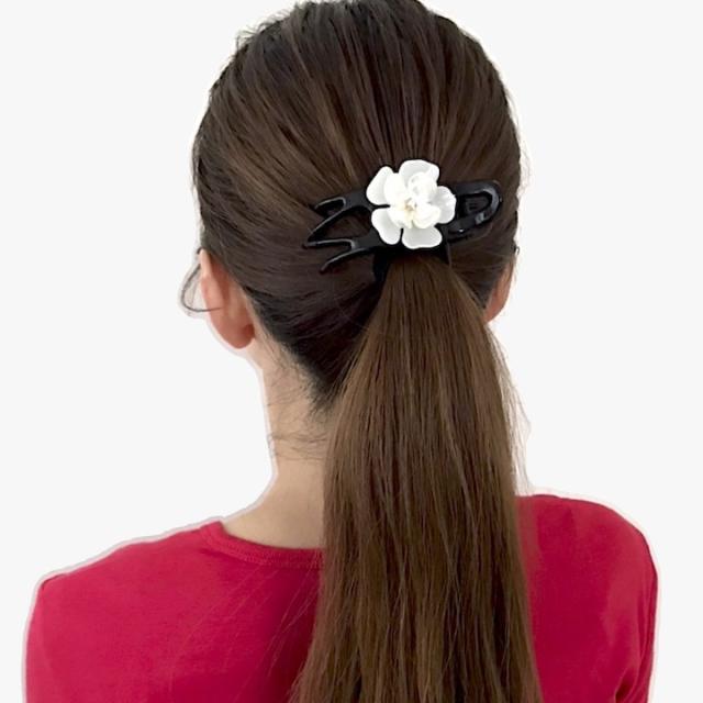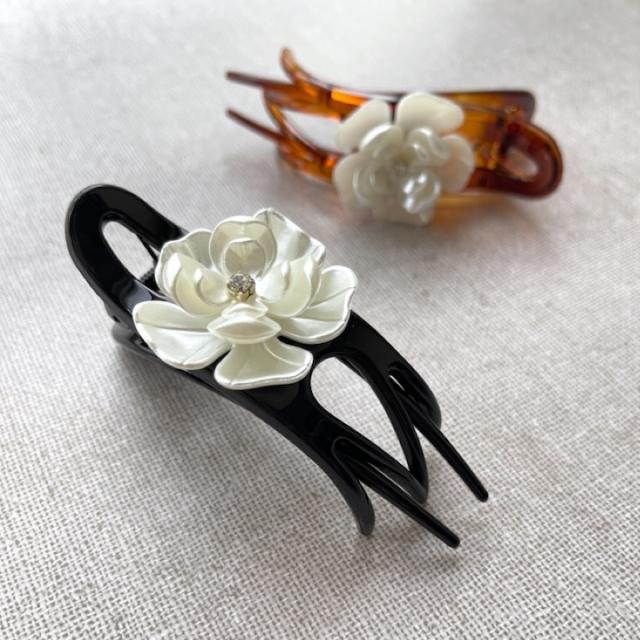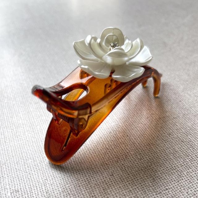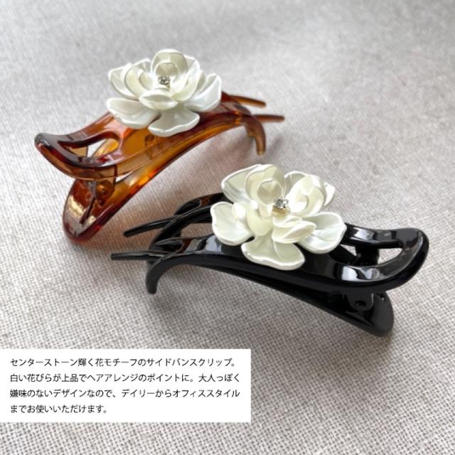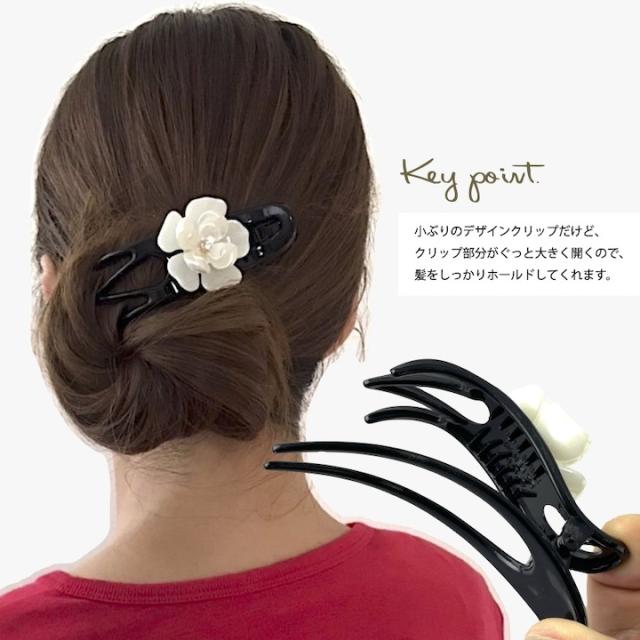 花モチーフが上品な小さめのサイドバンスクリップ。バネも強力なので、髪をしっかりホールドします。