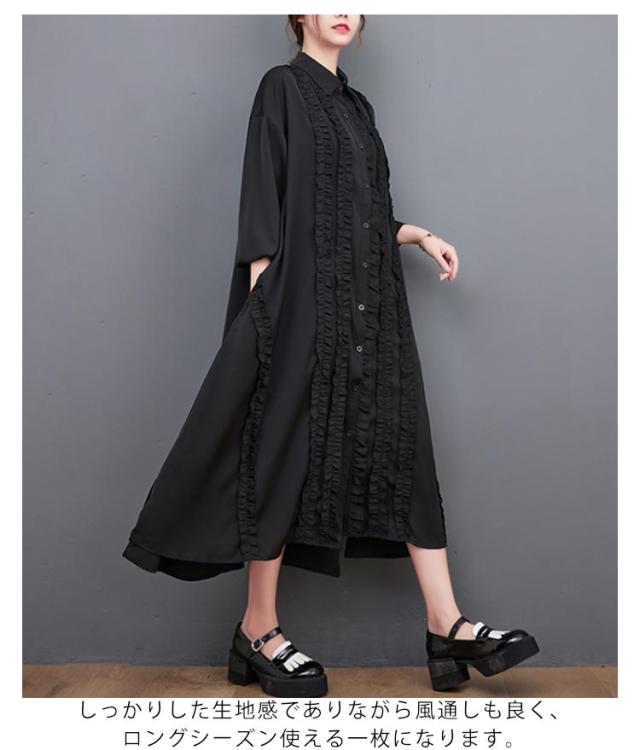 シャツワンピース ブラック 黒 長袖 サイトスリット入り フリル 綿 ポリエステル フレアワンピース ロング ロング丈 黒 大人女子 かわいい フレアワンピ ゆったり