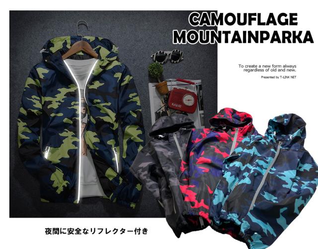 迷彩 ウインドブレーカー マウンテンパーカー リフレクター付 メンズ レディース カモフラ ブルゾン マンパー ナイロン パーカー ミリタリー ジャケット ストリート 小さいサイズ 大きいサイズ カジュアル 黒 赤 青 春 秋 冬 ライト アウター アウトドア 中学生 高校生
