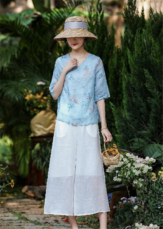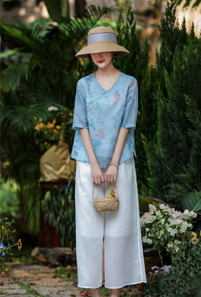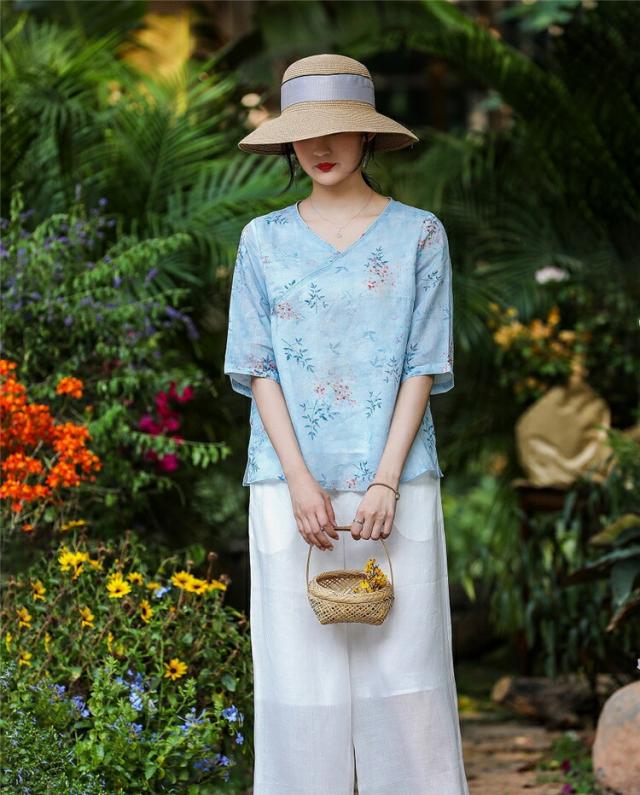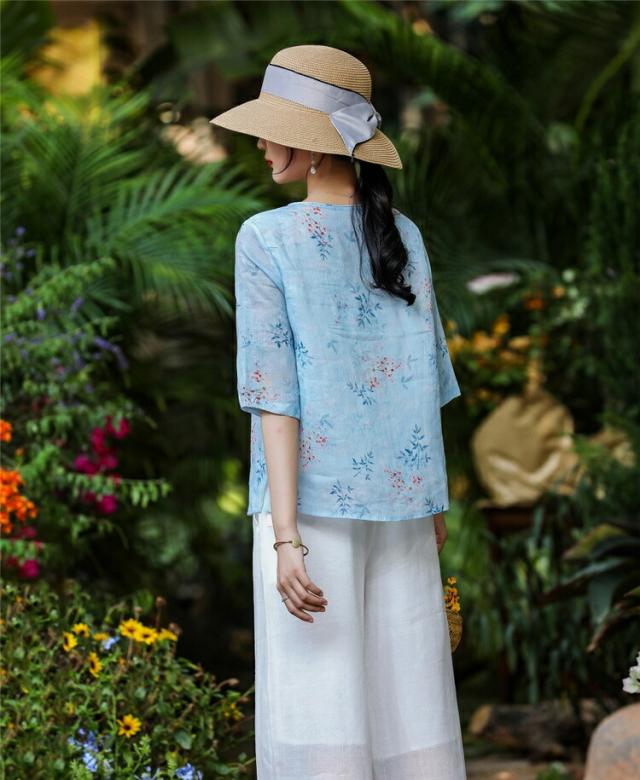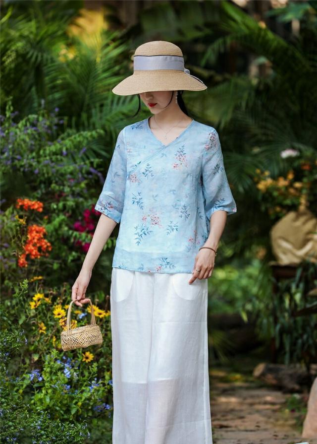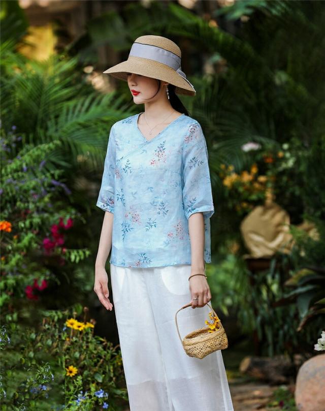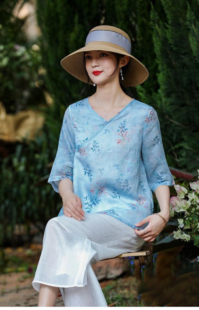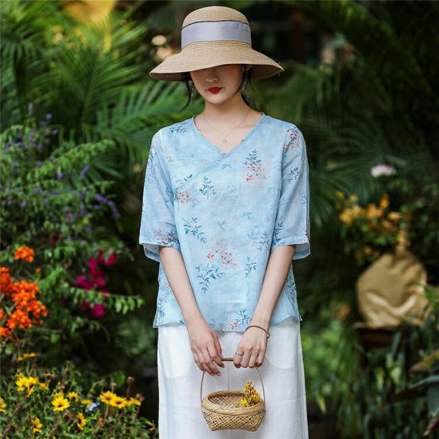 チャイナドレス風 民族風 レディース 五分袖花柄シャツブラウスチュニックブラウス 綿麻リネン 半袖 花柄シャツ ゆったり 体型カバー Vネック 大きいサイズ