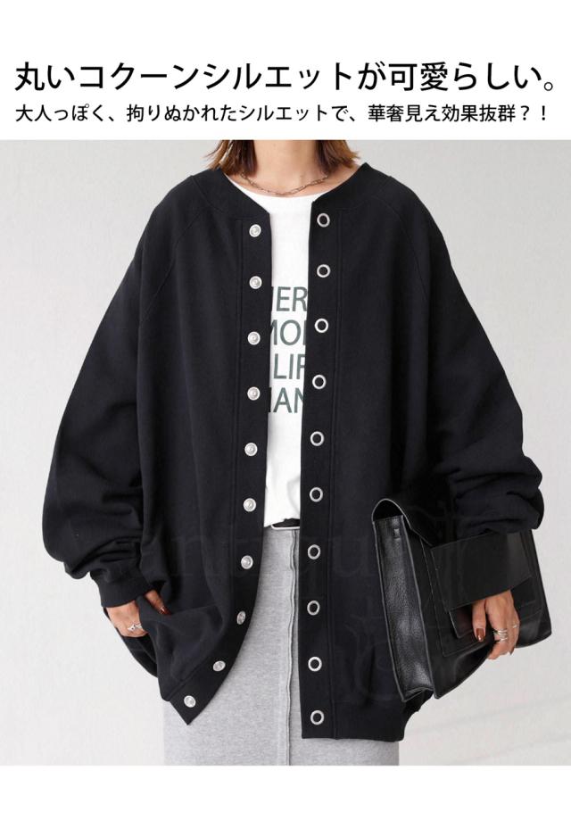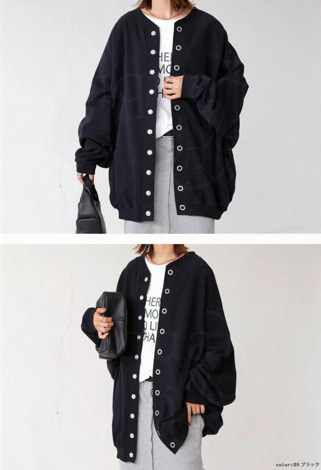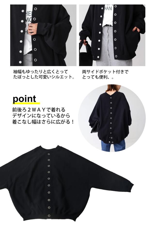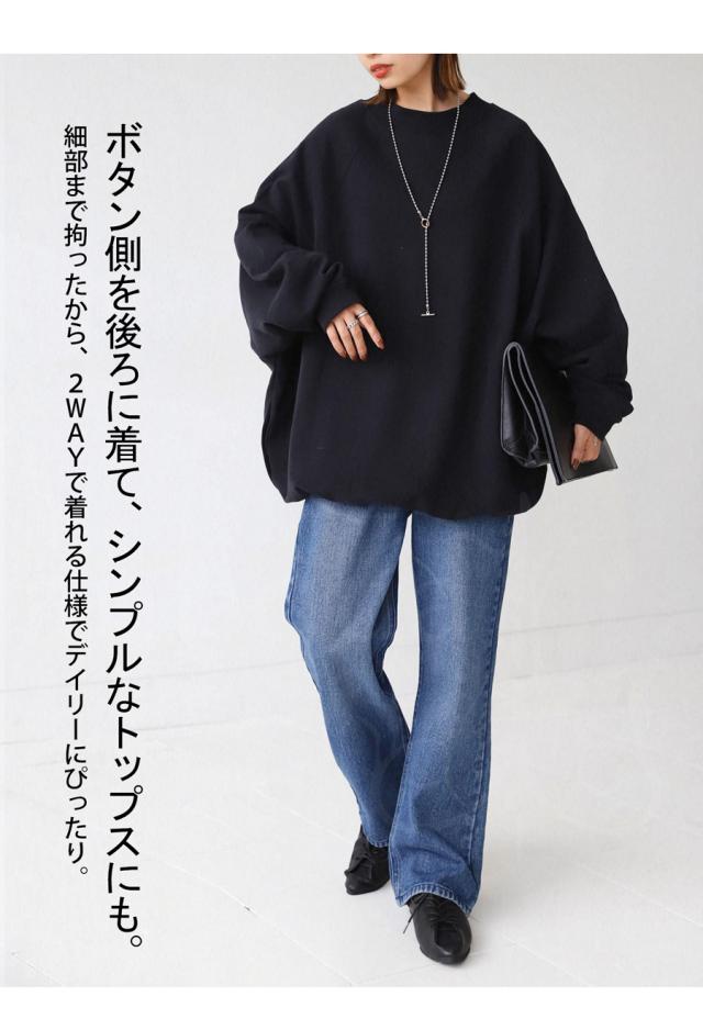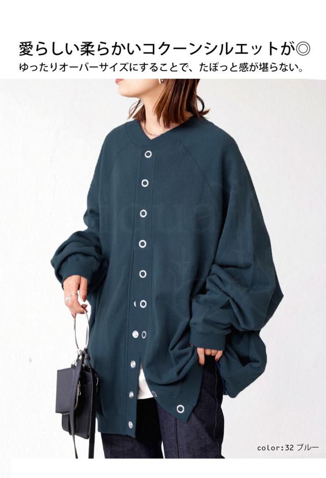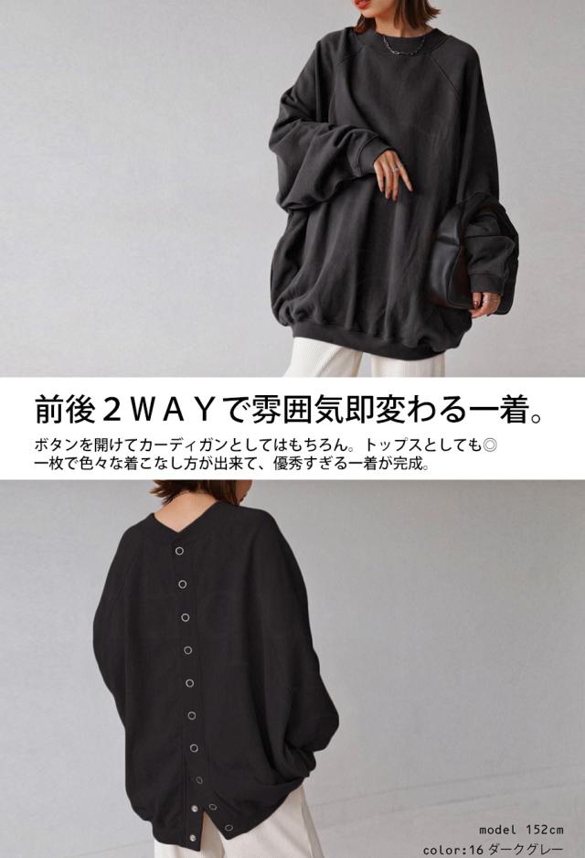pn-00365 トップス 綿100 裏毛 無地 前後 2WAY コクーン ゆったり 前開き スナップボタン スウェット トレーナー リブ ラグランスリーブ オーバーサイズ 大きいサイズ