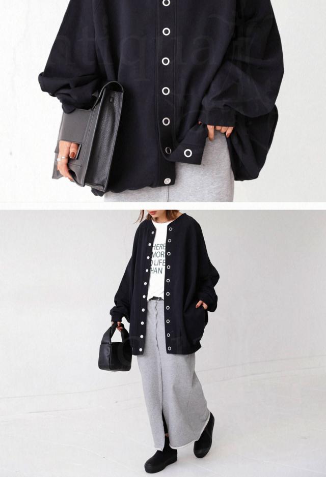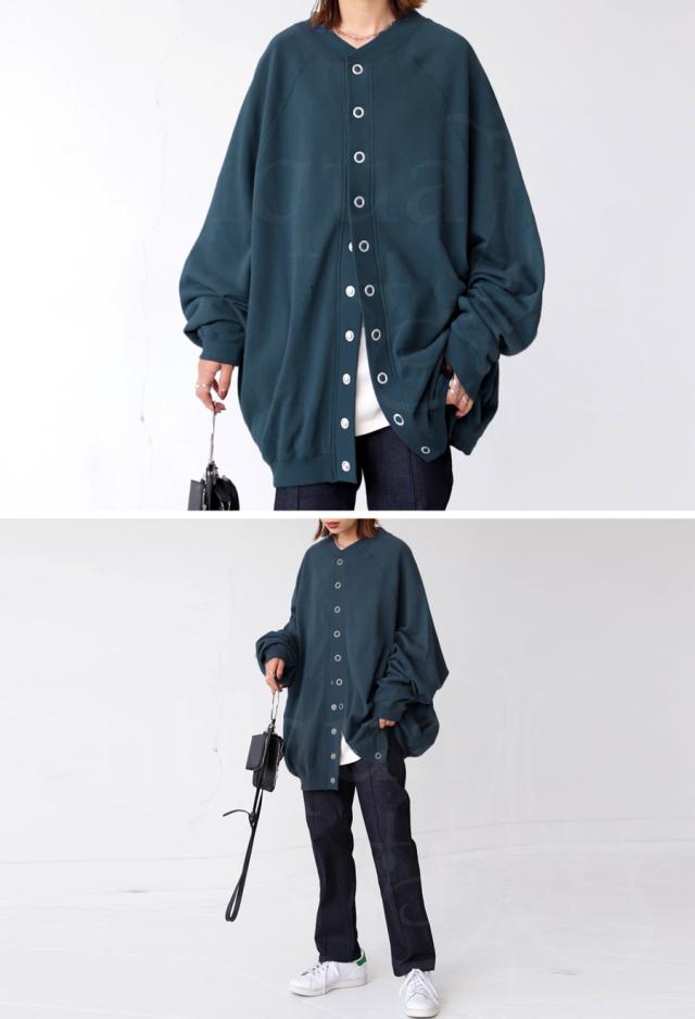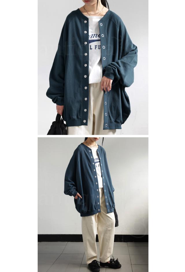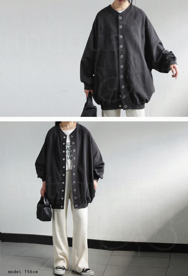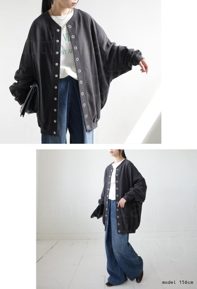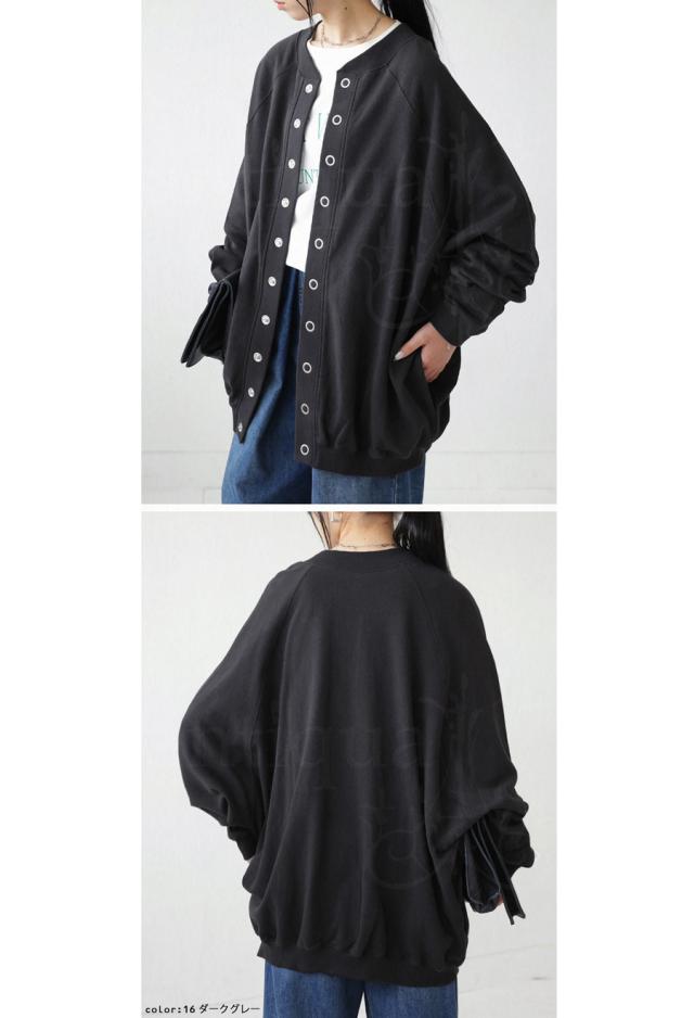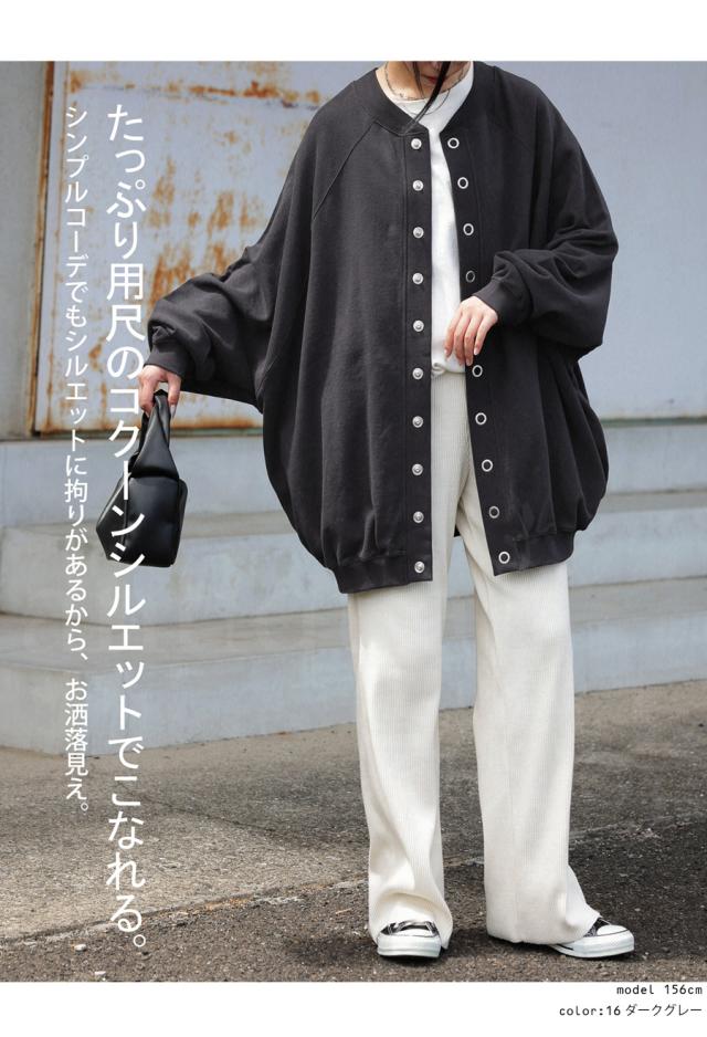 pn-00365 トップス 綿100 裏毛 無地 前後 2WAY コクーン ゆったり 前開き スナップボタン スウェット トレーナー リブ ラグランスリーブ オーバーサイズ 大きいサイズ