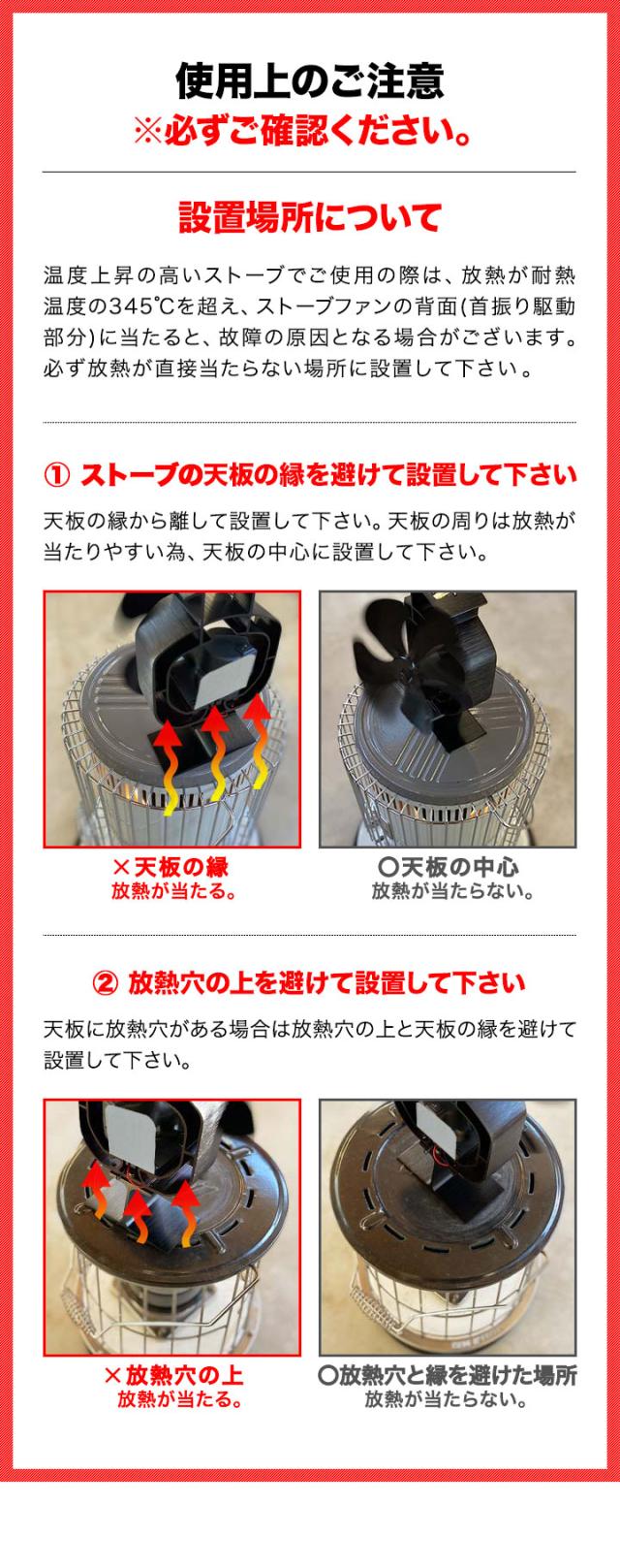 | 特記事項: ・ご使用後は本体が非常に熱くなっています。移動するときは必ず手袋を着用してください。 ・作動中は羽根に触れないように気をつけて下さい。 ・ストーブの表面の温度が345℃以上になっている場合はご使用をお止め下さい。 ・煙突ストーブの場合は煙突の前に設置せず側面に設置して下さい。 |