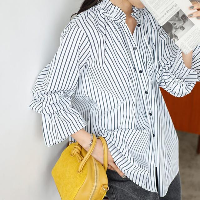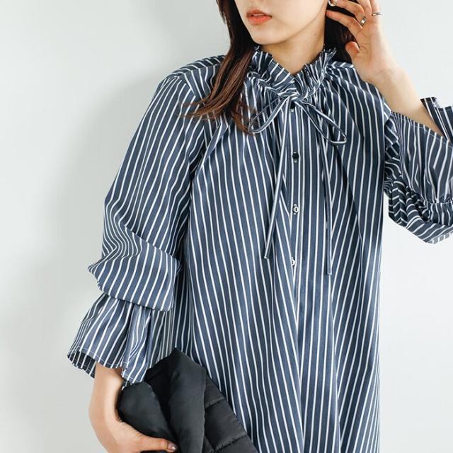 女性らしいデザインをストライプでシャープな印象にした大人っぽいブラウスです。