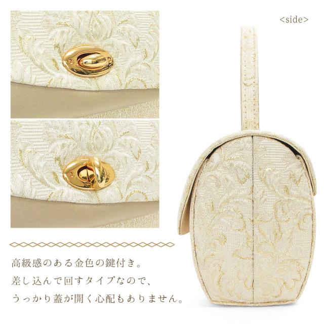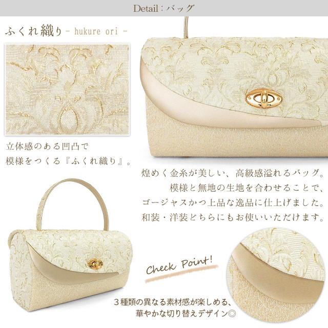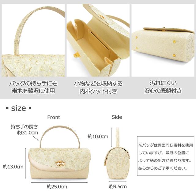 バッグ単品でもお使いいただけ、留袖はもちろん披露宴やパーティー、様々なシーンにお使いいただけます。