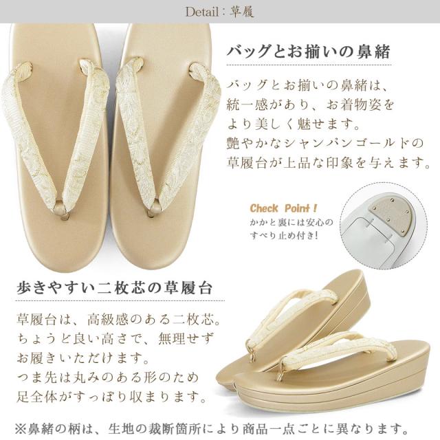 女性の最高礼装≪ローブデコルテ≫をもとに、どんなシーンでもお使いいただける上品な草履とバッグに仕上げました。