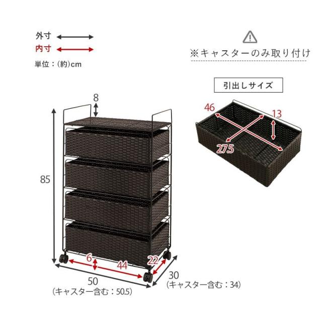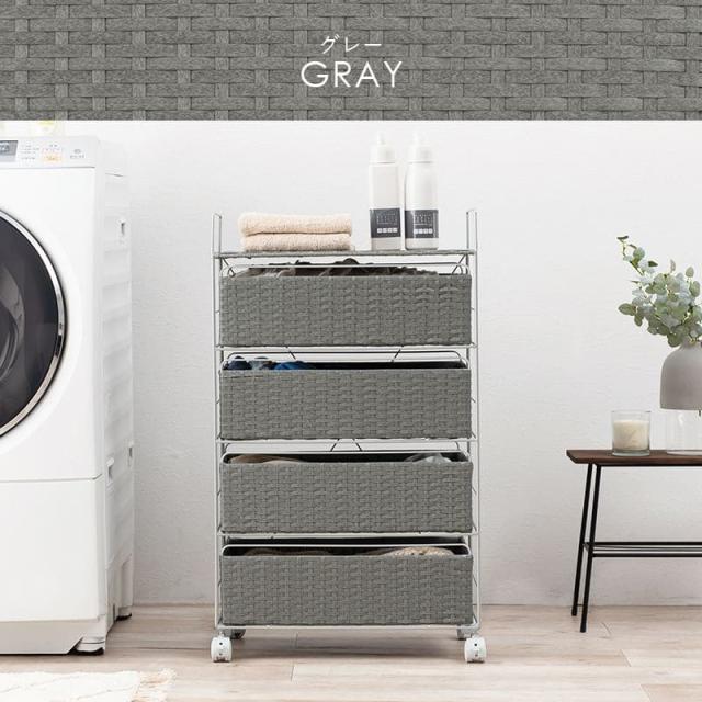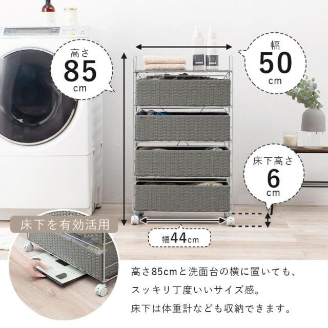 ランドリーチェスト ラタン 4段 引き出し 幅50 奥行30 スリム ランドリー収納 キャスター 籐 ワゴン カゴ 収納 薄型 ランドリーラック おしゃれ ロータイプ