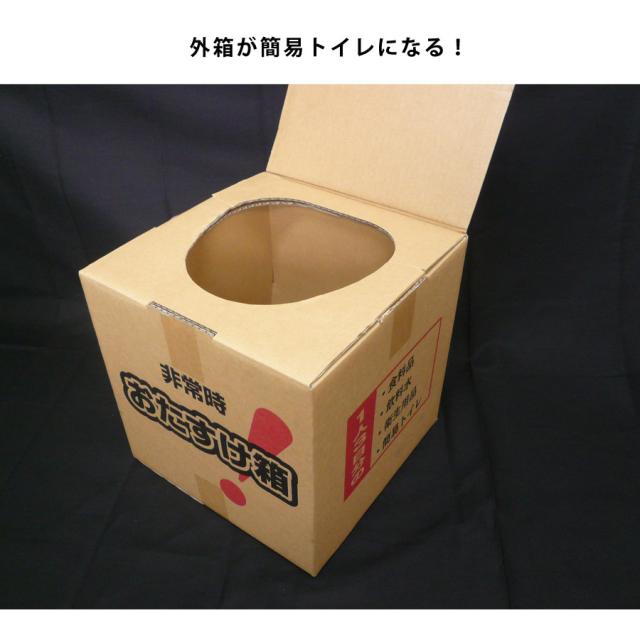 突然の災害に備え、この「非常時おたすけ箱」を。1人3日分の食料品と衛生用品などが入り、しかも、外箱が簡易トイレとして使用できる緊急時対応ボックスです。自宅は勿論、車の中や指定避難所とされる場所、帰宅困難者の発生が予想される職場や公共施設などに備蓄をおすすめいたします。
