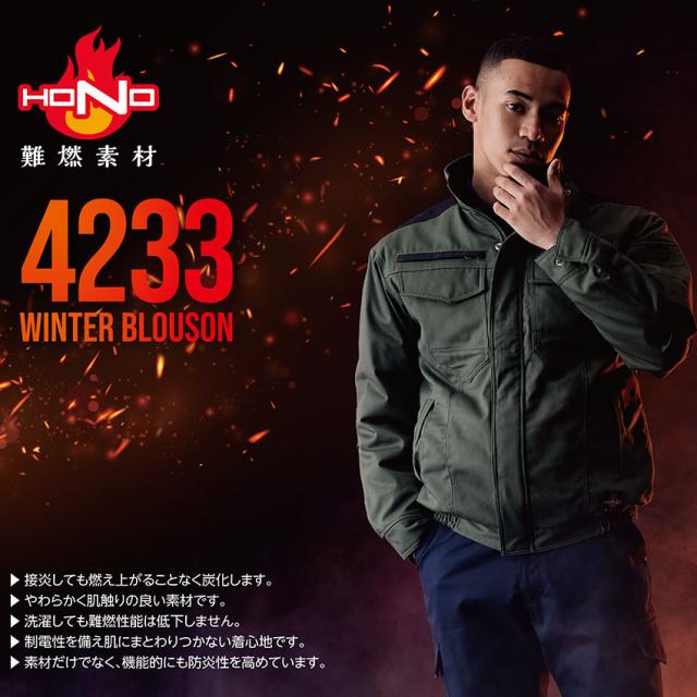 難燃防寒ブルゾン 作業服 ジャケット 作業着 ジャンパー 上着 ブルゾン ドカジャン 防寒着 難燃 燃えにくい 耐炎 耐熱 帯電防止 防炎 裏アルミ 防寒 村上被服 鳳皇 HOOH HONO 4233 綿100 コットン 人気 安い アウトドア ワーク ウ