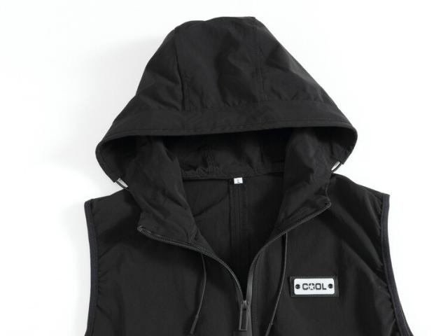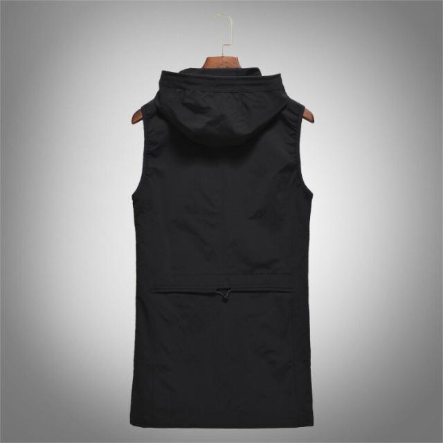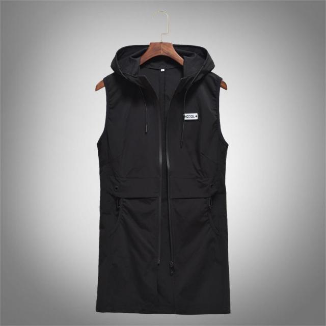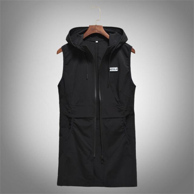 メンズシンプルベスト ジレベスト紳士 チョッキ お兄系ジレ ロングベストフード付き 春秋カジュアル軽量アウターブラック