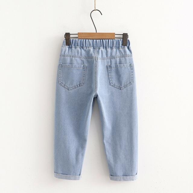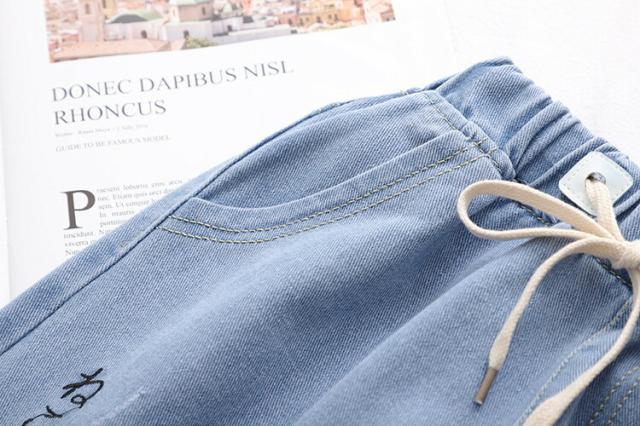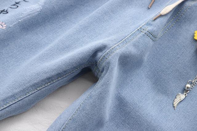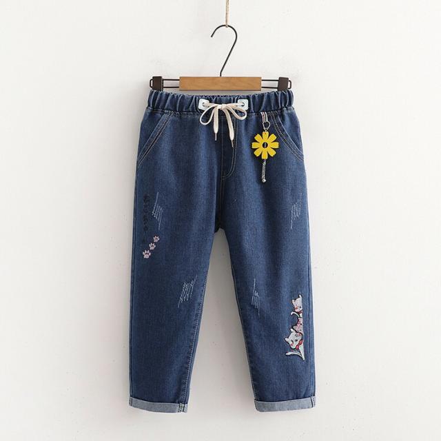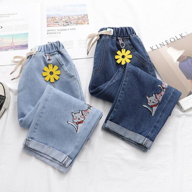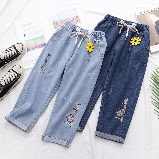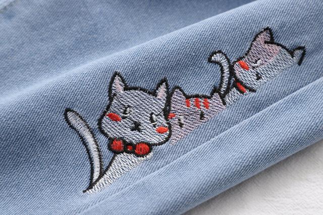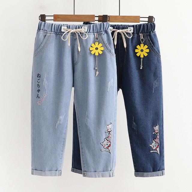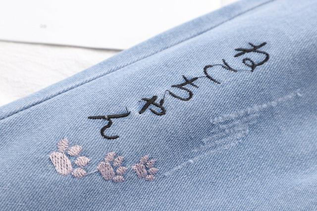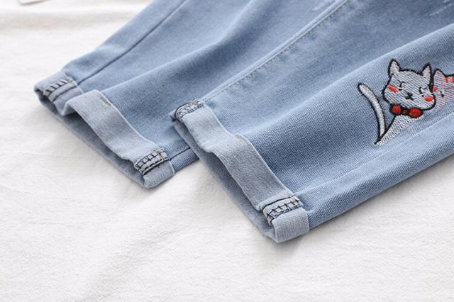 デニム パンツウエストゴム 7分丈 猫ちゃん 刺繍ジーンズ パンツ ハイウエスト デニム ズボン 美脚 体形カバー ゆったり おしゃれ