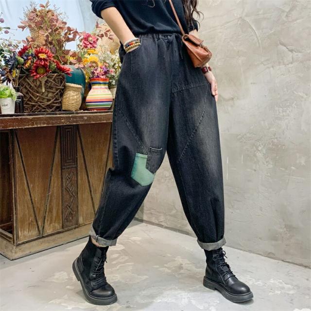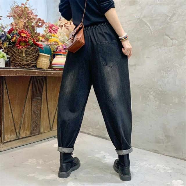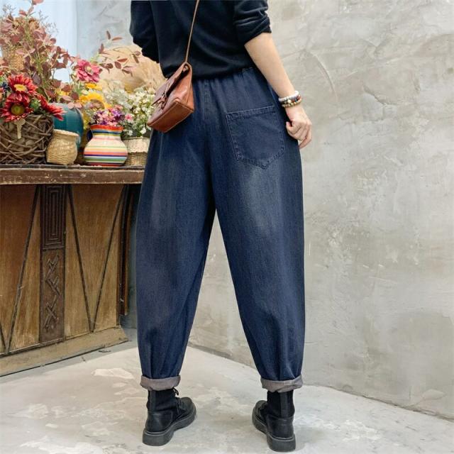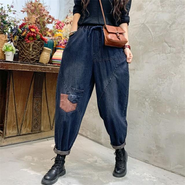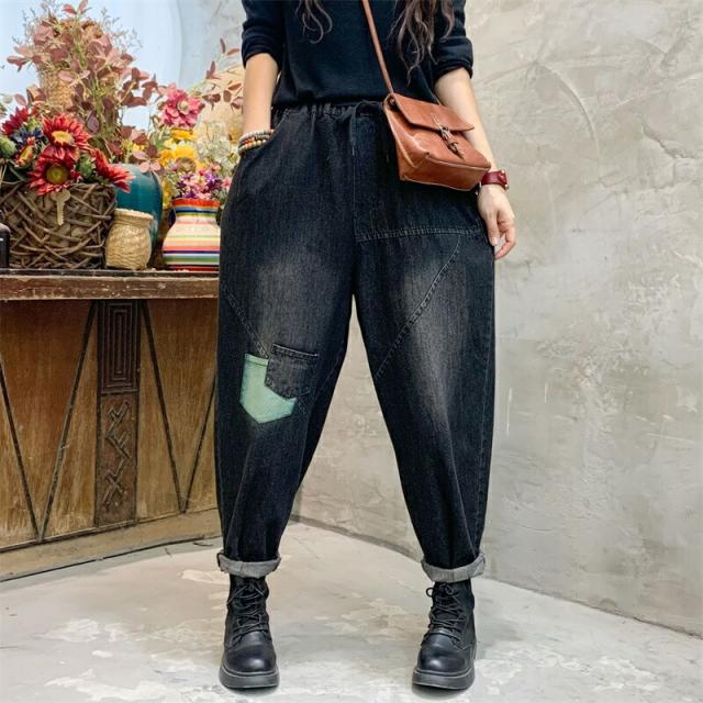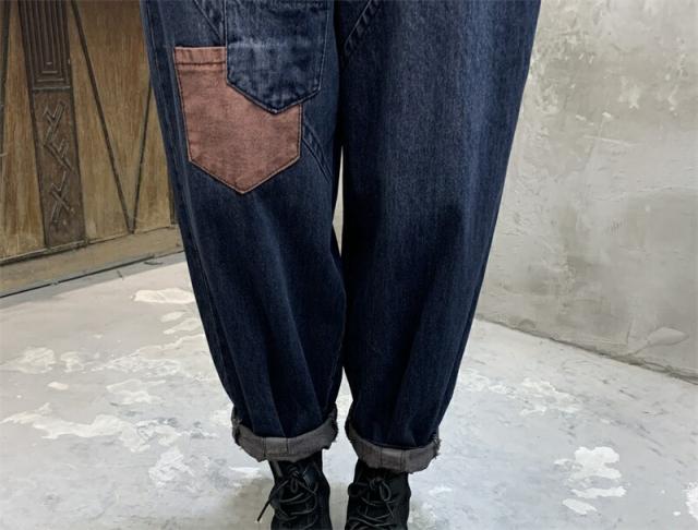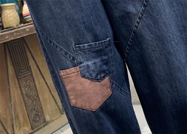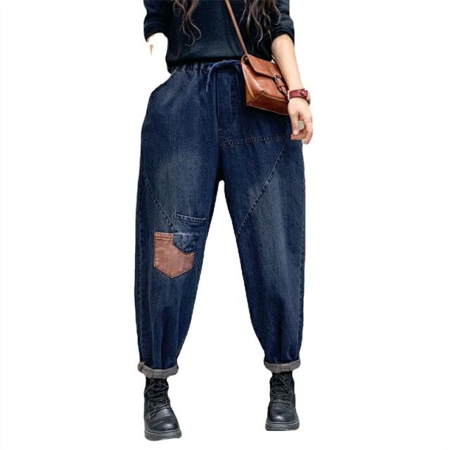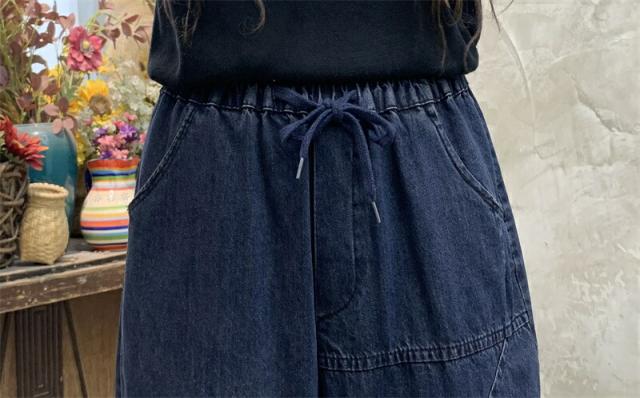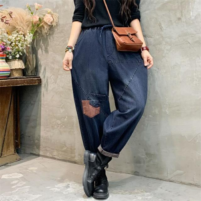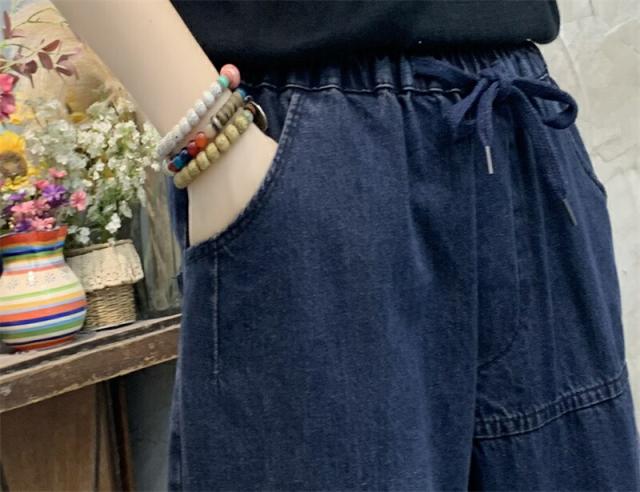 2色デニムパンツ股上深めパンツ ウエストゴム サルエル ジーパンロールアップ ワイドパンツ 大きいサイズジーンズ デニム ボーイフレンドデニム