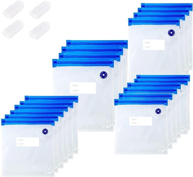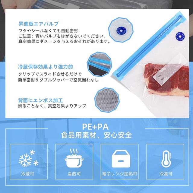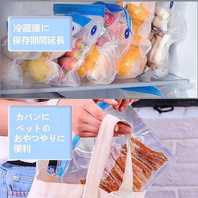 【セット内容】真空保存袋x20枚、密封用スライダーx4枚ク袋セットです。