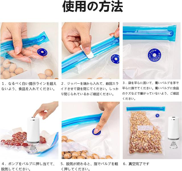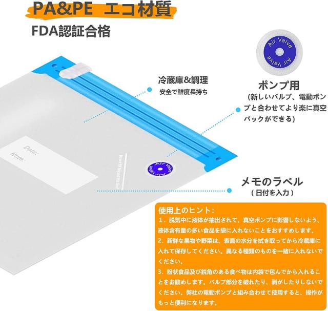【強い密閉性】専用密封袋が作った真空状態により、食品の腐敗、酸化、変質などを防げ、食品の保存に最大限の便利さをご提供できます。本製品は、食品の新鮮度を3〜5倍に延長し、食物の元の味と色を保留することができます。新しいバルブ、電動ポンプと合わせてより楽に真空パックができる。*ご注意:バルブ部分を破れたり、剥がしたりしないでください。真空できない恐れがあります。