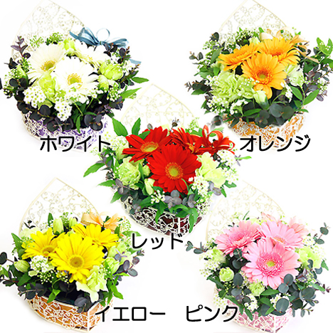 花材 ガーベラ(指定色)、スプレーカーネーション、グリーン等