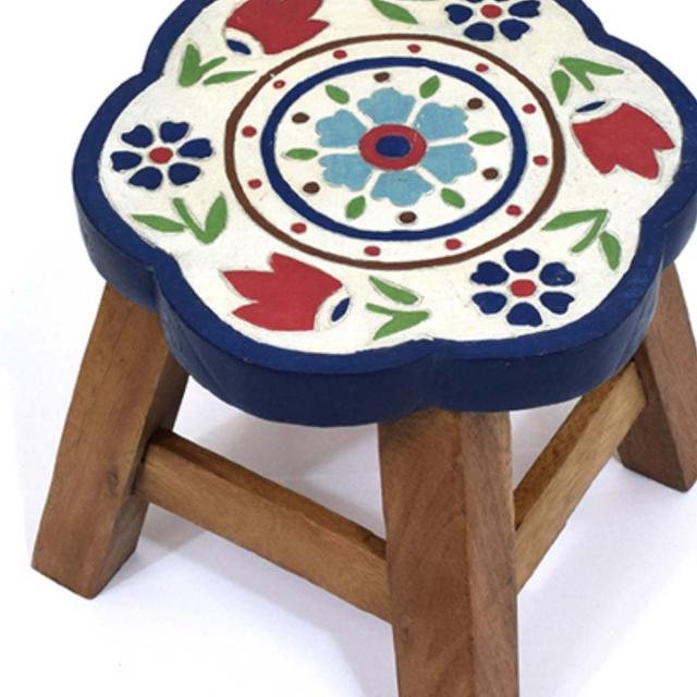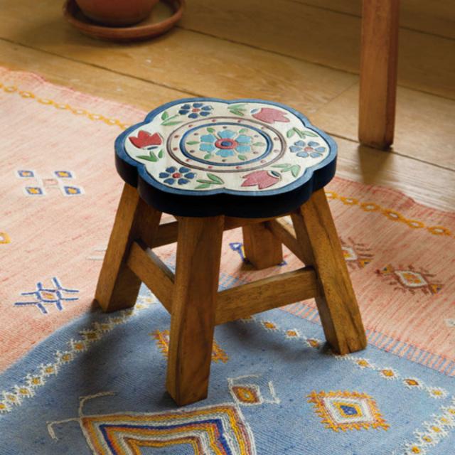 コンパクトサイズのスツールですが、座面はしっかりとした厚みがあり、安定しています。一つ一つ丁寧に手彫りで作られた温かみのあるハンドメイドの商品で、天然素材特有の素材感を楽しめる一品です。