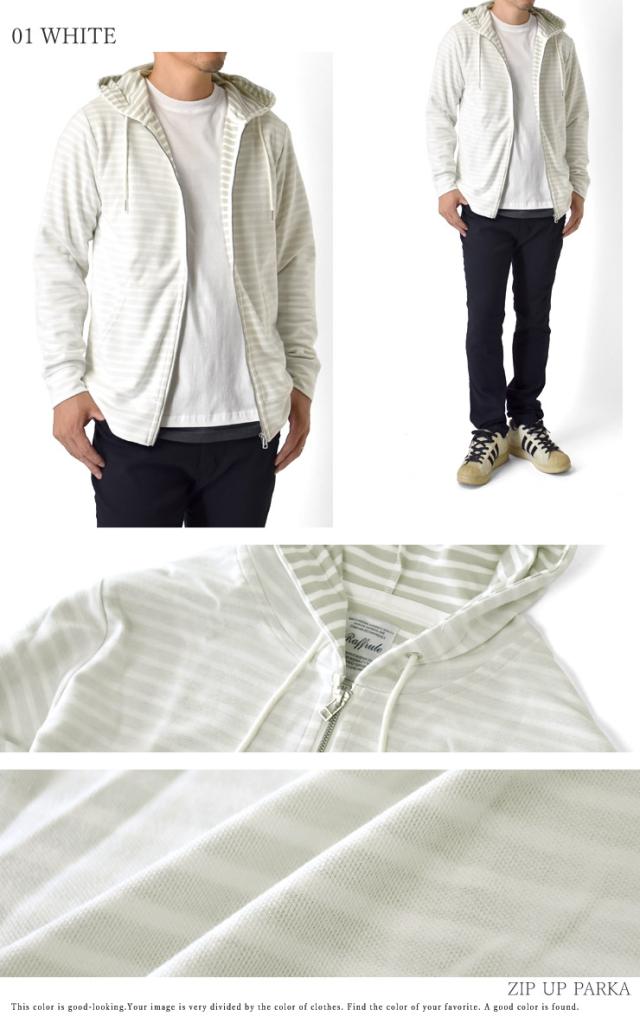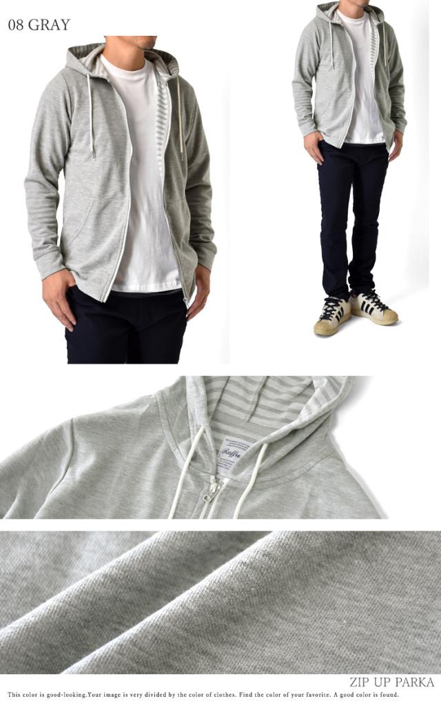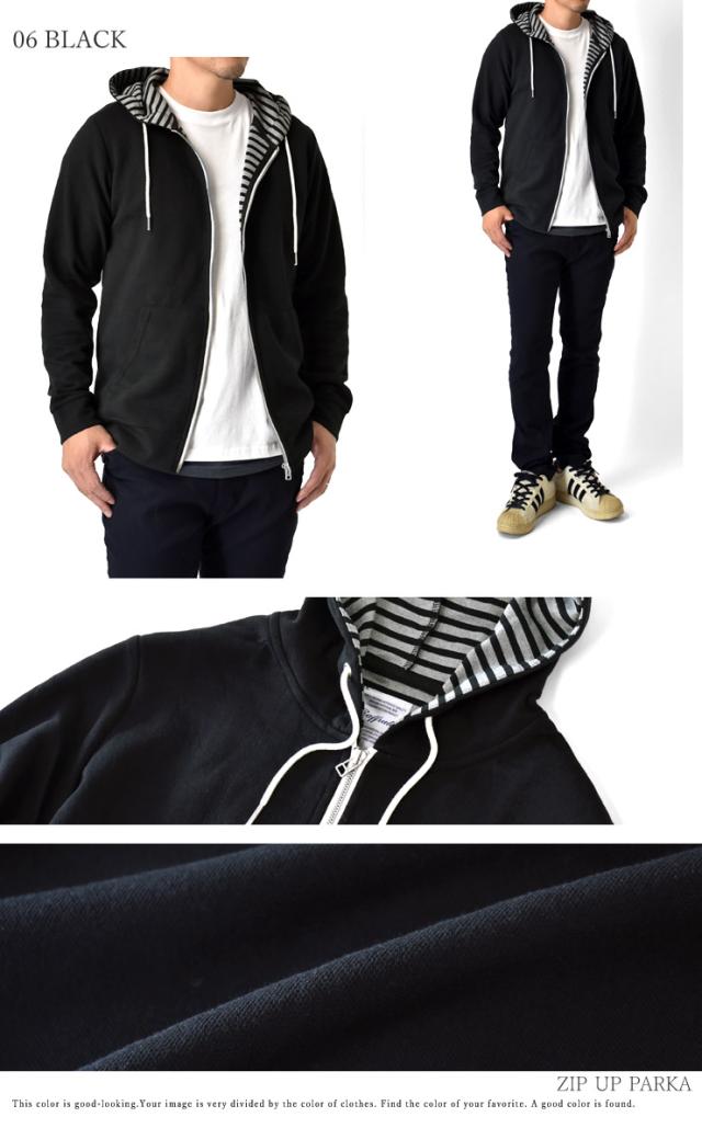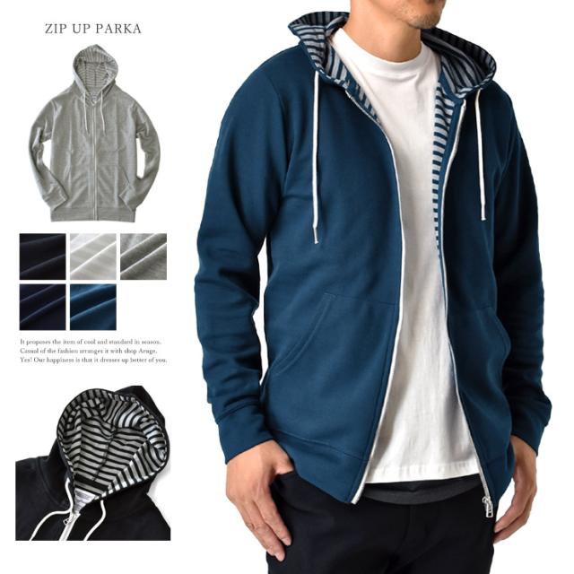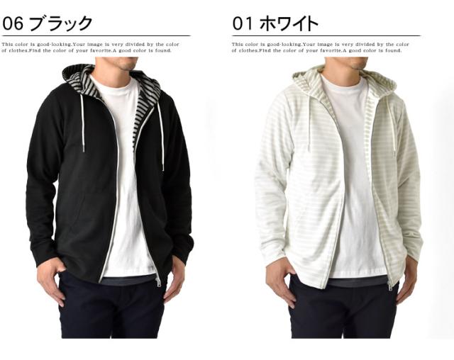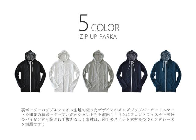 裏ボーダーのダブルフェイス生地で凝ったデザインのメンズジップパーカー!スマートな印象の裏ボーダー使いがオシャレ上手を演出!!さらにフロントファスナー部分のパイピングも施され手抜きなし!素材は、薄手のスエット素材なのでロングシーズン活躍です!