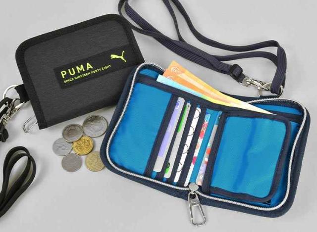 丈夫なリップストップ生地を使用したカジュアルなPUMA(プーマ)のラウンドファスナーウォレット!収納物を落としにくい、安心のラウンドファスナータイプ。小銭入れが大きく開いて出し入れしやすいお財布です。カードポケットも5つ付いているので、通学に便利♪長さ調節できるストラップで持ち方を選べるのがポイント!ショルダーベルトやウォレットチェーンに変身します◎