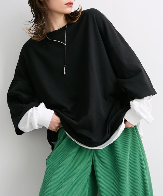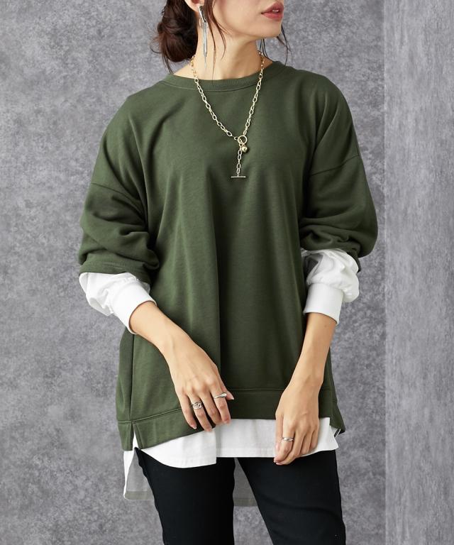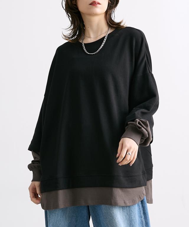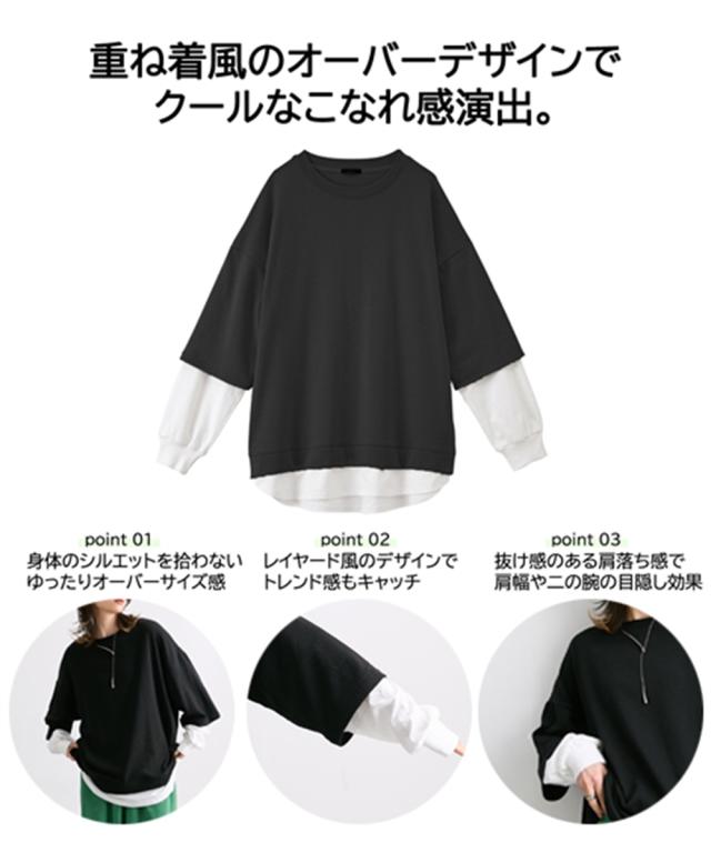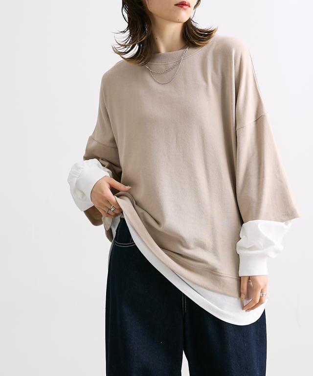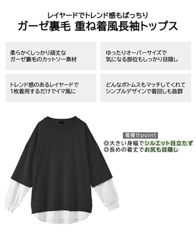 ガーゼ裏毛の重ね着風長袖トップス!シンプルな無地デザインながらも、トレンド感のある重ね着風で1枚着用していてもしっかりこなれ感。柔らかく触り心地のいいガーゼ裏毛素材が、ごわつき無くストレスフリーな着用感を発揮してくれます。どんなボトムスもしっかりマッチしてくれて、クールな印象にもカジュアルな印象にも仕上げてくれる万能アイテム!