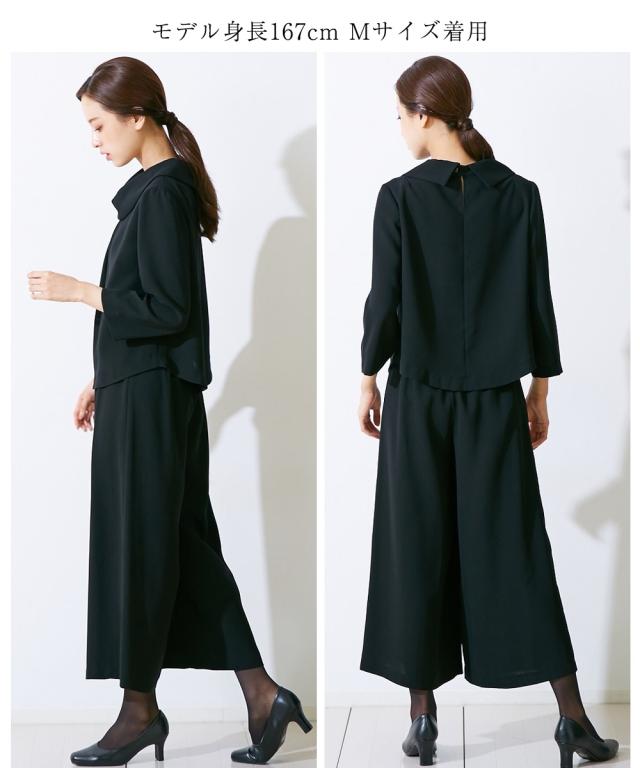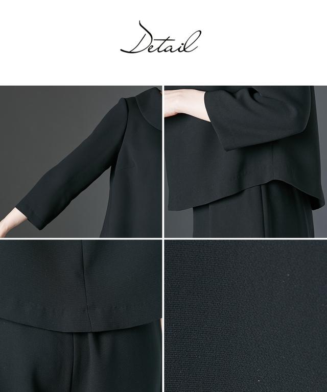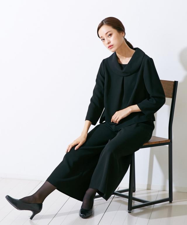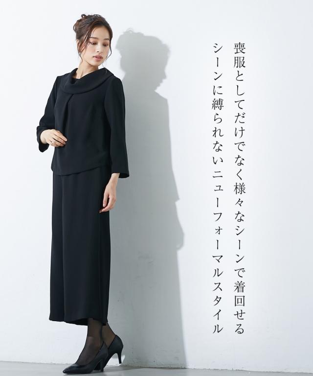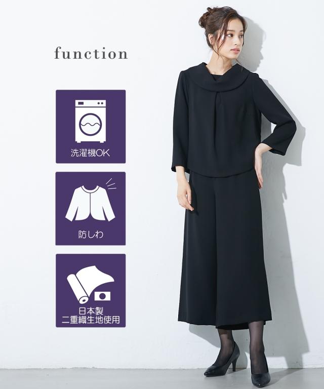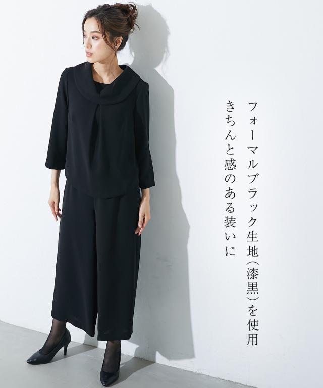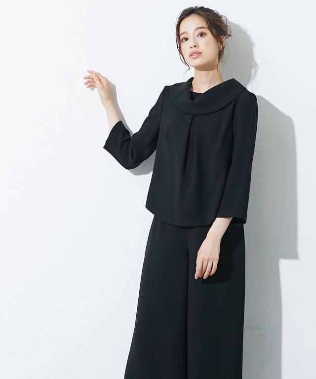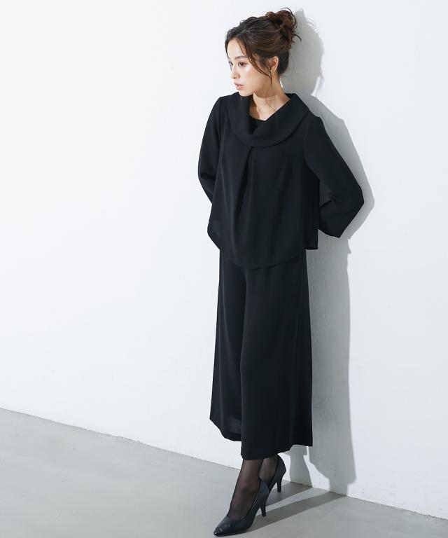 【喪服・礼服】<Callarus>日本製生地使用洗える防しわロールネックブラウス+ワイドパンツセットアップ<大きいサイズ有>