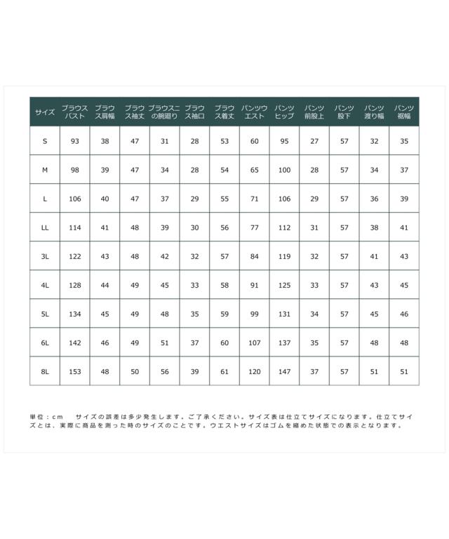 品質=ポリエステル100%(織物 ダブルクロス)[裏地]無 ブラウス:後涙ボタン開 パンツ:前ファスナー内ホック開 ウエスト後ゴム入 ポケット両脇 ※この商品は2点同サイズのみで販売します。 原産国:中国製(企画デザインは日本) 洗濯表示:洗濯機OK ネット使用