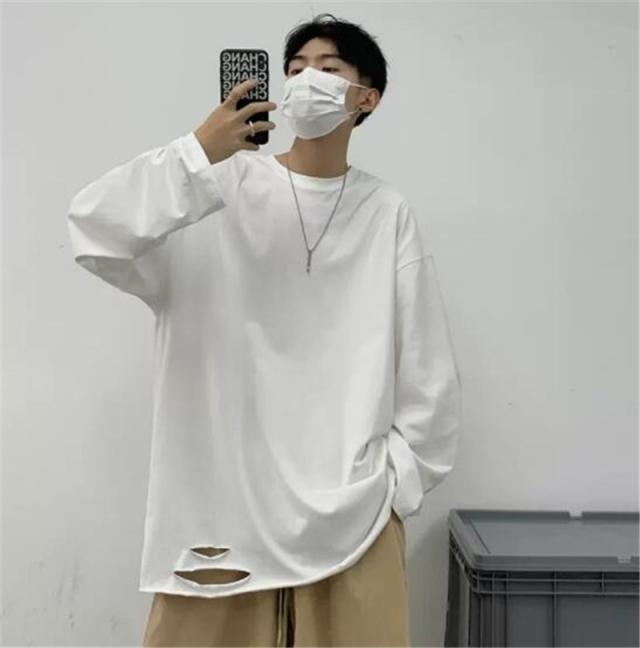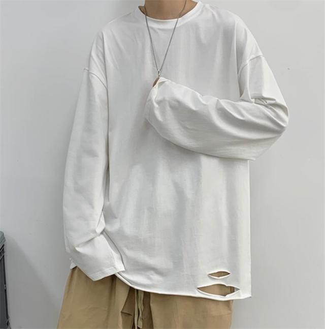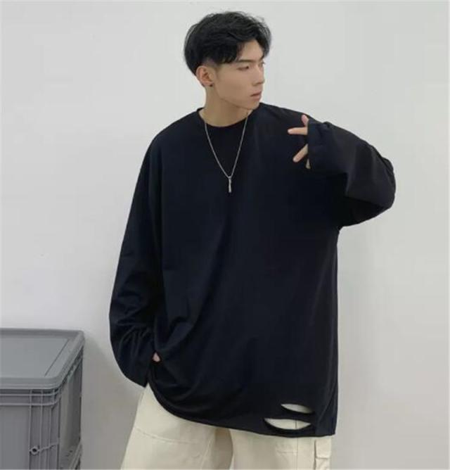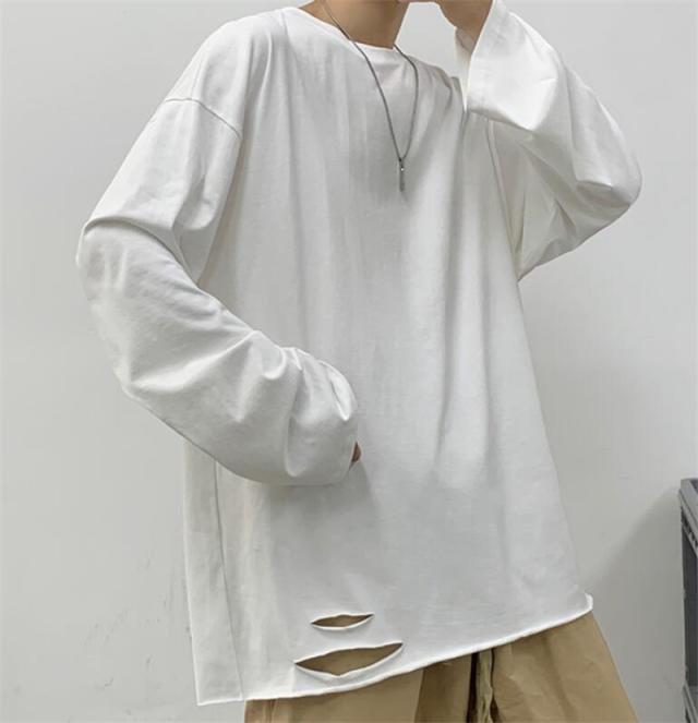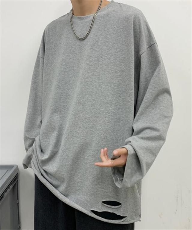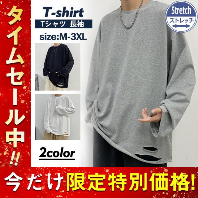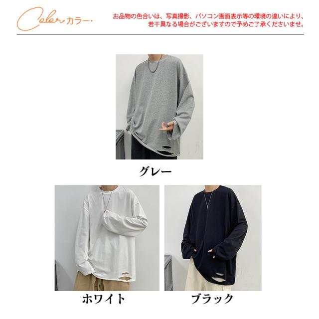 Tシャツ メンズ 長袖 カットソー 綿 クルーネック ブラウス インナー ダメージ加工 切り替え 無地 ゆったり 体型カバー スポ