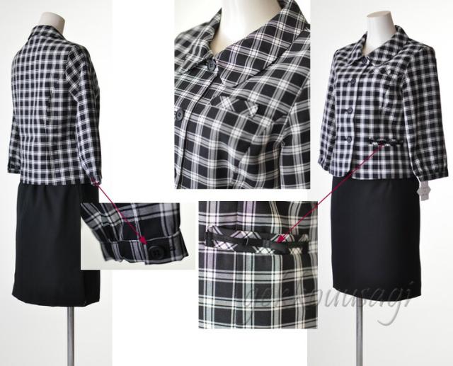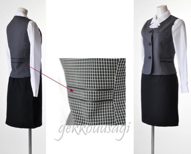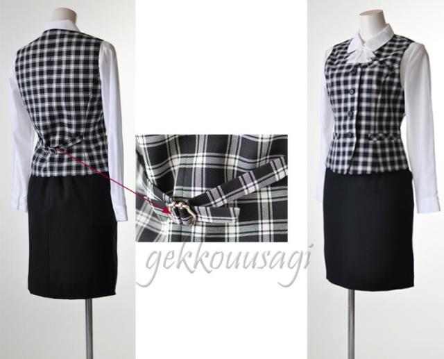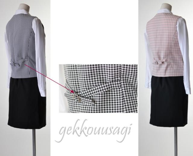 後ろの飾りベルトで小幅調節可能。スリムなウエスト調節ができます(b.黒白格子柄ベスト、f.ベージュベストは後ろ飾りベルトはありません)。