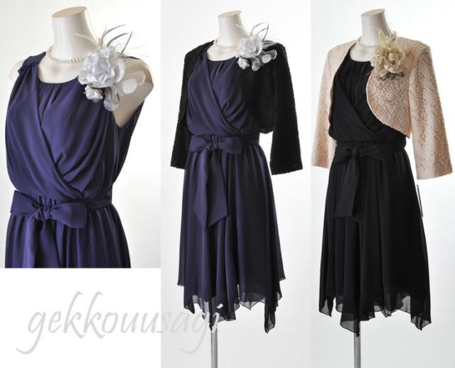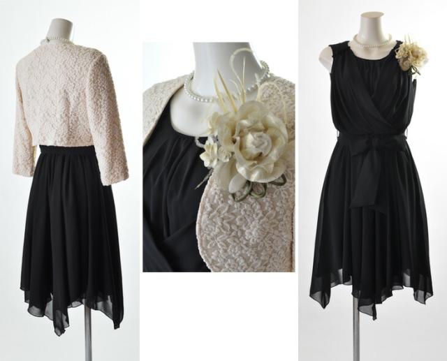 黒ボレロにはパープルドレスの、ベージュボレロには黒ドレスのセットになります。