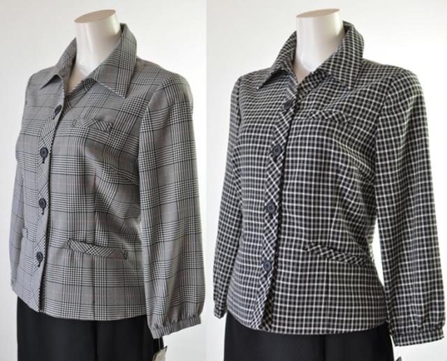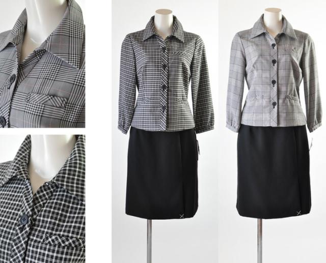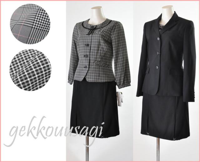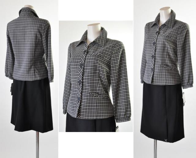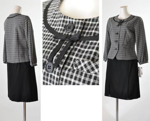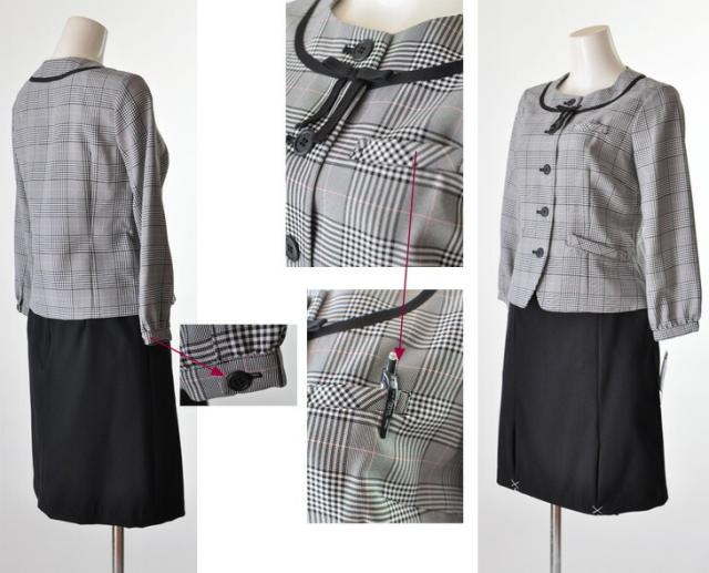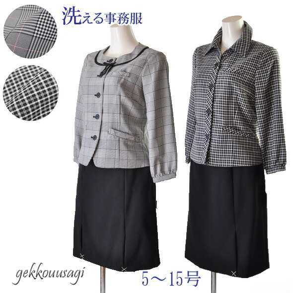 送料無料 人気の事務服 襟付き七分袖ジャケット・ノーカラー七分袖ジャケット スーツ5号/7号/9号/11号/13号/15号 洗える七分袖ジャケット+洗えるウエストゴム入りスカート黒【グレンチェック・黒白チェック】