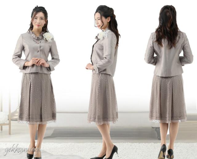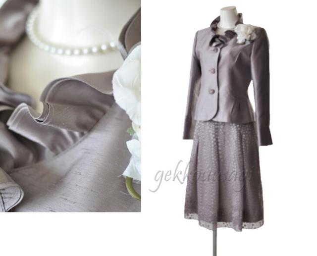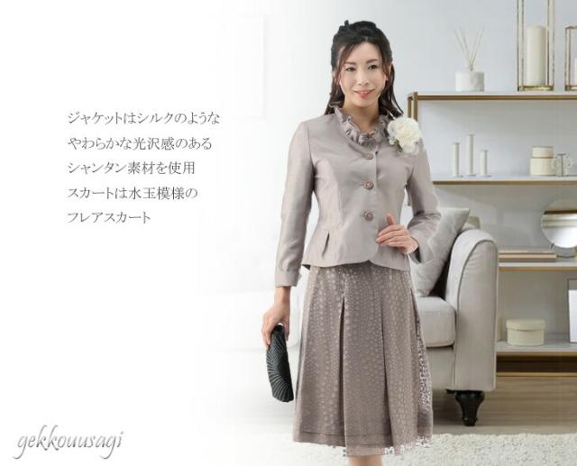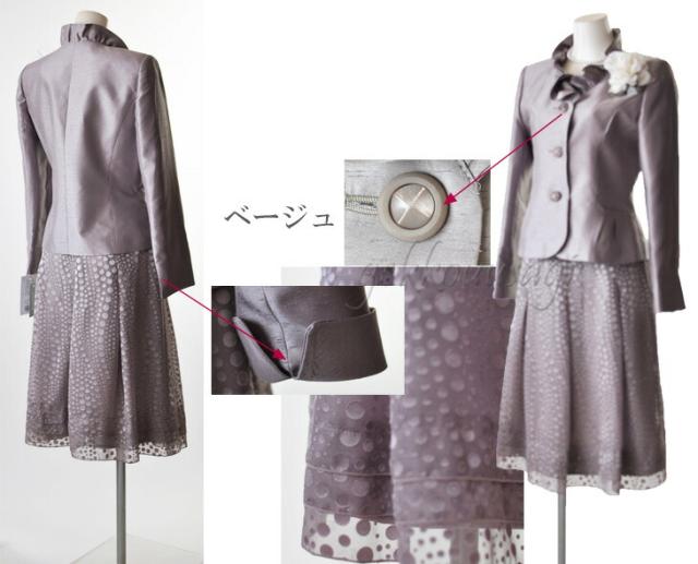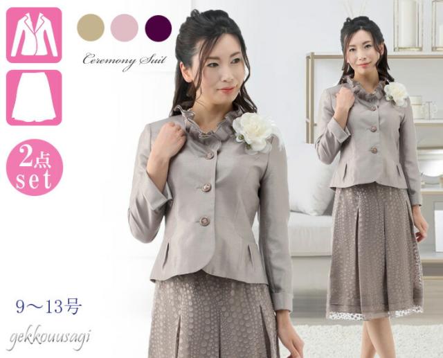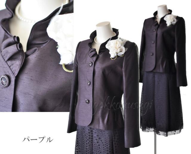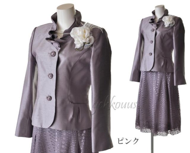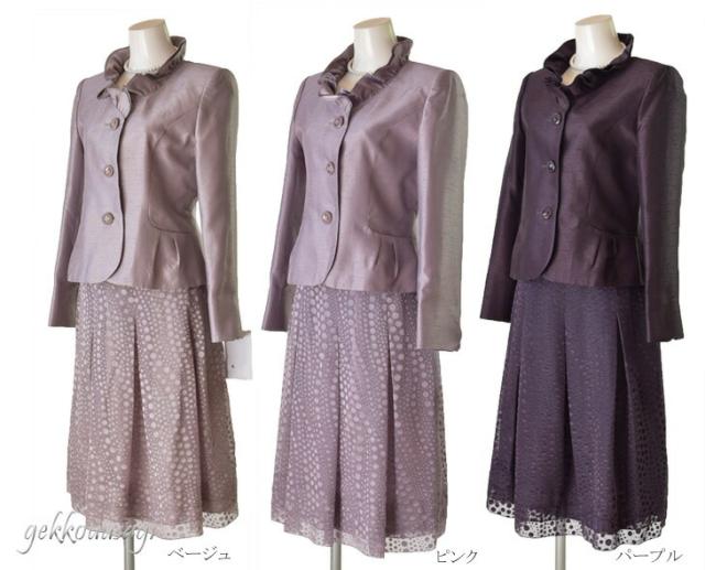 フォーマル レディーススーツ シャンタンスーツ 卒業式 入学式 フリル襟 ジャケット ティアード裾 フレア 水玉スカート ベージュ ピンク パープル 834