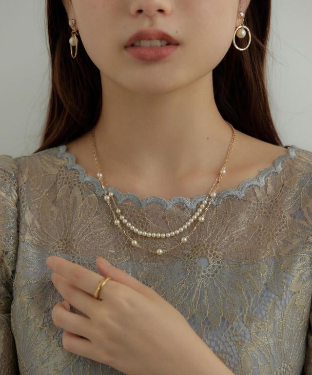 デザインの違うパールネックレスを2連にして華奢ながらも存在感を出しました。