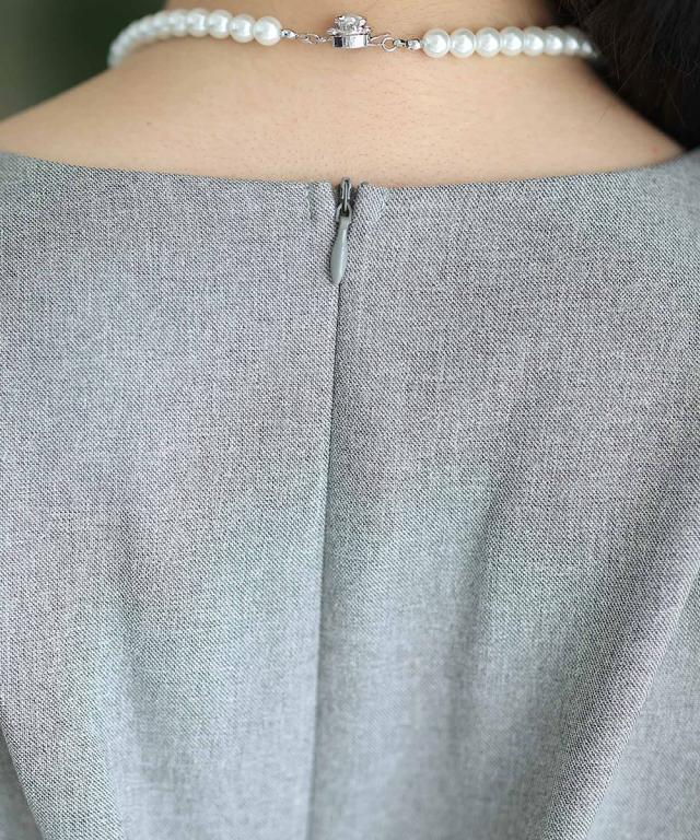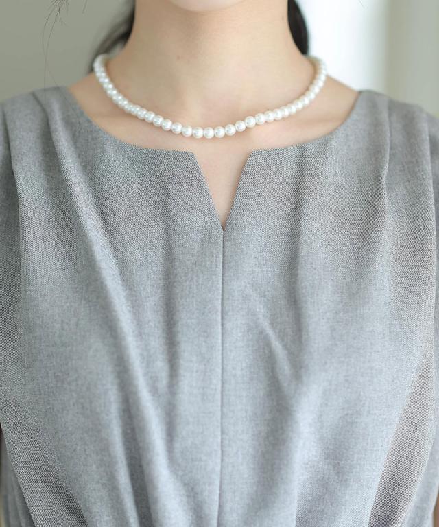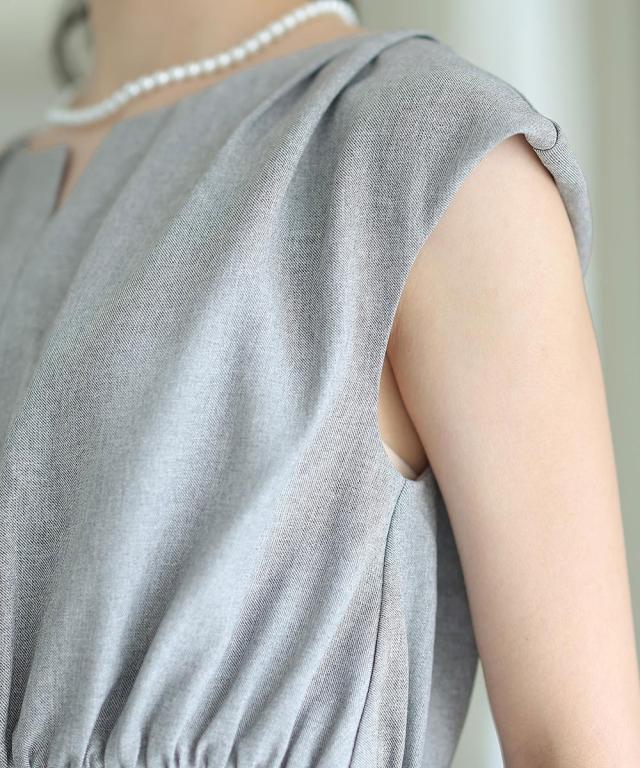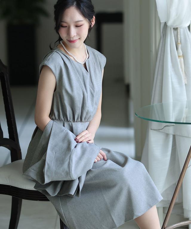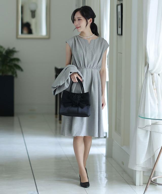 キーネックとトップスにタックの入ったワンピースがオシャレ。