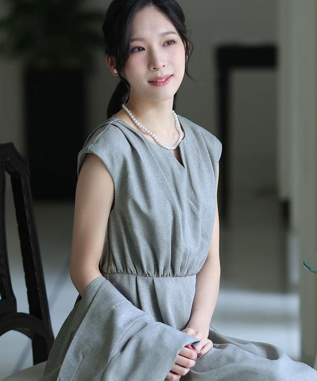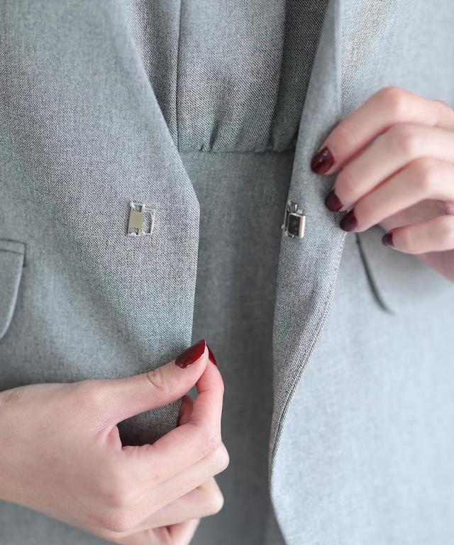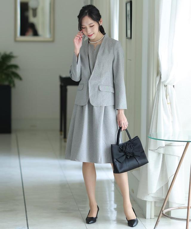 タックの入ったワンピースとノーカラージャケットの2点セット