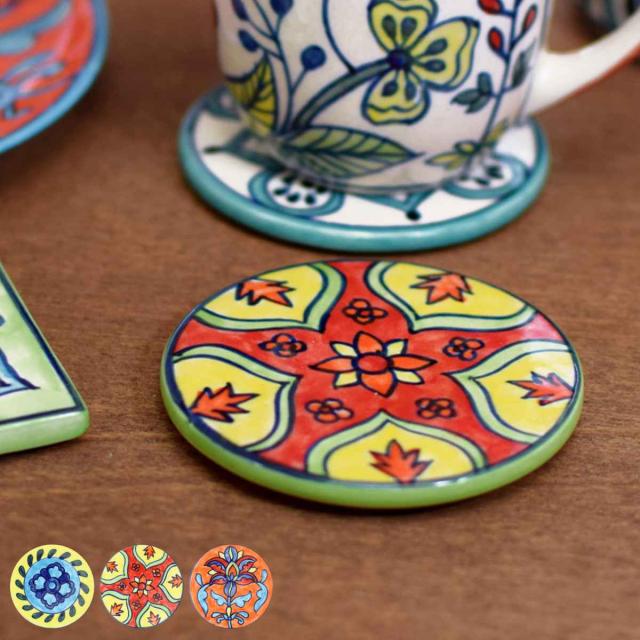 コースター 8cm プリヤ ストーンウェア ( 食洗機対応 グラスマット テーブルウェア キッチン雑貨 インテリア エスニック ハンドメイド カラフル クッション付き キズ防止 テーブルコーディネート おしゃれ )