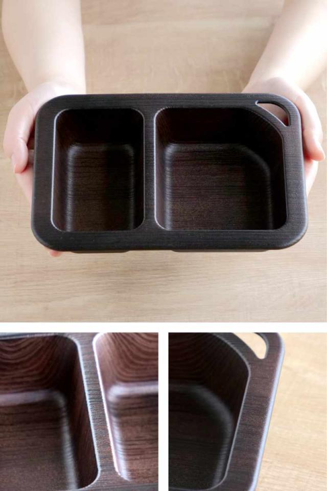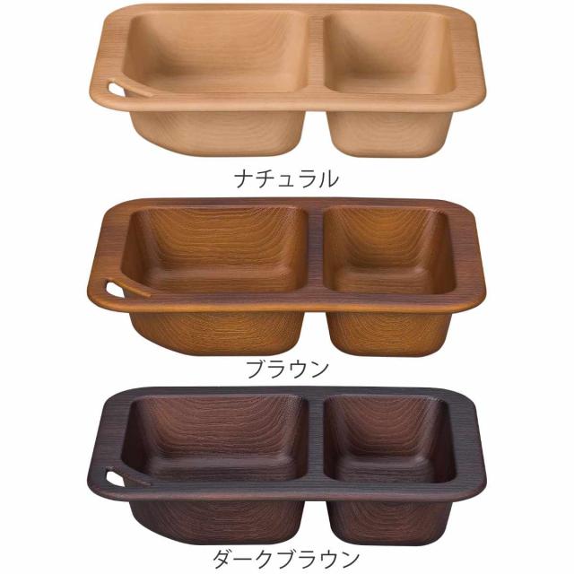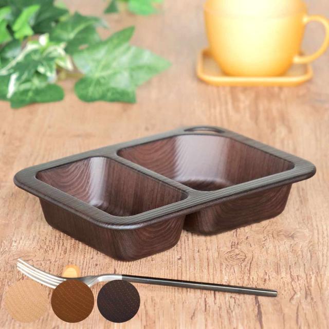 アウトドアや持ち運びにもぴったりな木目調のプレートです。どんなお料理にも合わせやすいデザインで食卓に馴染みやすいです。仕切りが付いているのでご飯とおかずを分けて入れることができ、適度な深さがあるのでバーベキューやアウトドア料理にも最適です。