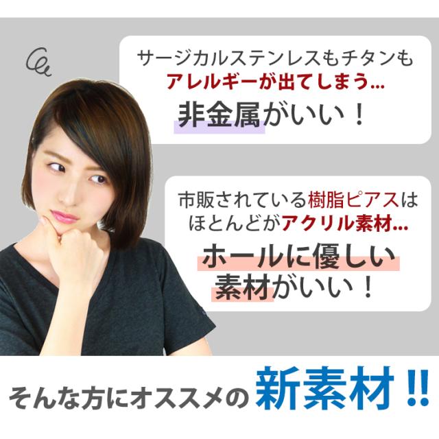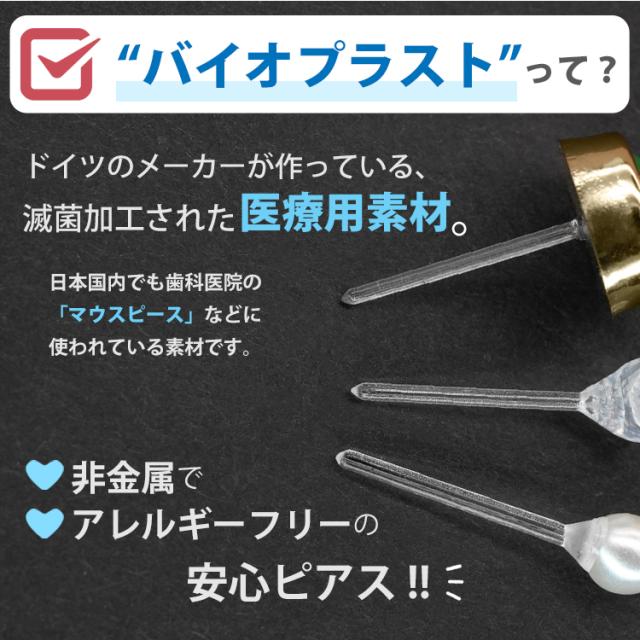 医療用ステンレス製でもアレルギーが出てしまうつらい金属アレルギーの方にオススメですのバイオプラスト軸のピアスです。サージカルステンレスでもチタンでもアレルギーがでてしまう・・・市販されている樹脂ピアスはほとんどがアクリル素材ですが、当商品はホールにやさしいバイオプラスト素材のピアスとなります。非金属だからこそ熱伝導率が低くサウナなどもつけっぱなしOKです。