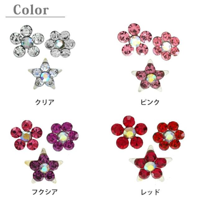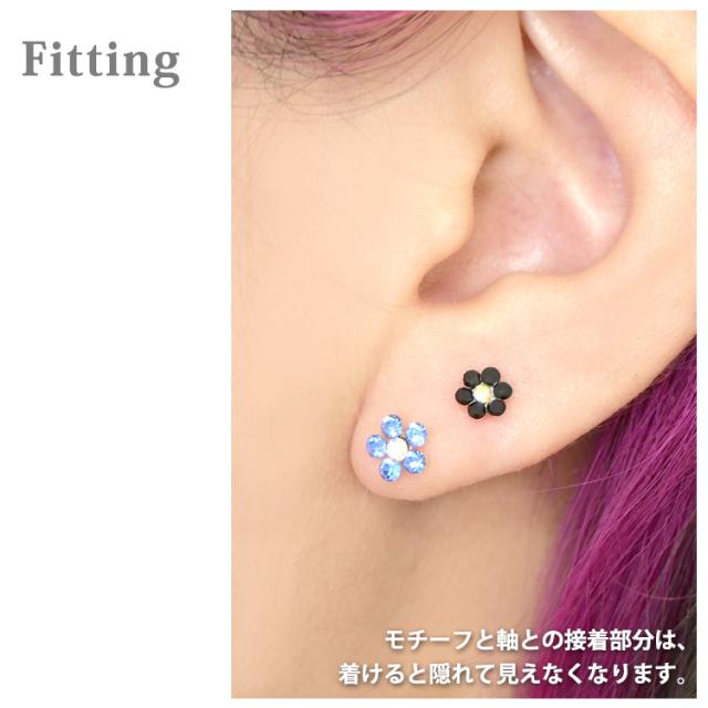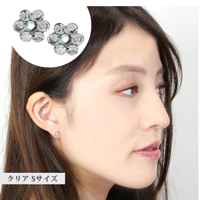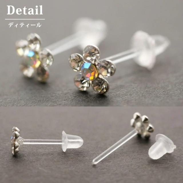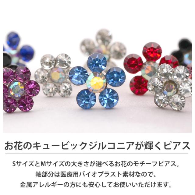 お花のキュービックジルコニアが輝くピアス。2つのサイズが選べるお花のモチーフピアスです。軸部分は医療用バイオプラスト素材なので、金属アレルギーの方にも安心してお使いいただけます。