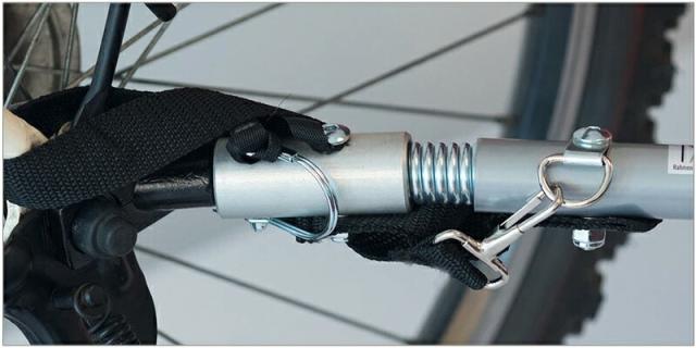 ■トレーラーの牽引バー(接続部)に自転車が倒れても、トレーラーは倒れない構造が組み込まれています。
