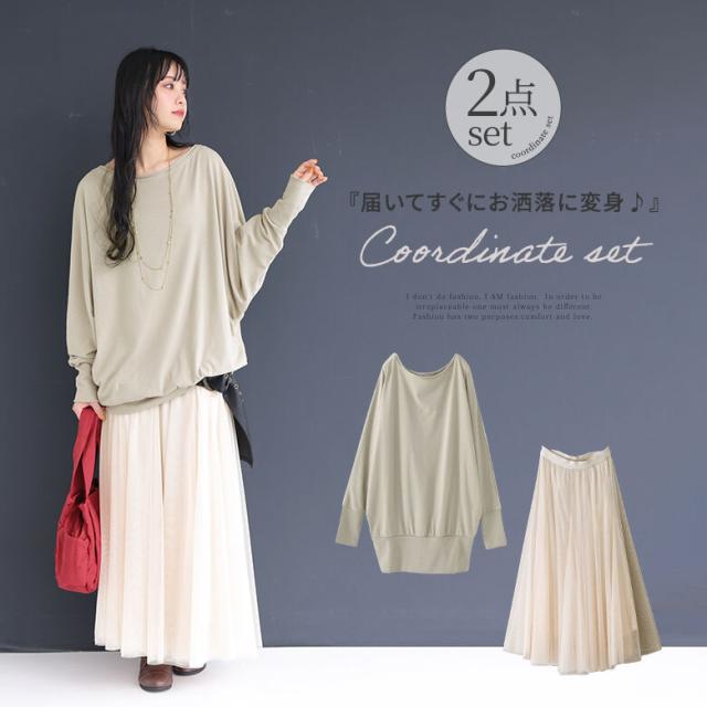 最大1000円オフ26日10時迄 『センスに差がつく♪ゆるっとラフなシンプルコーデ2点SET』 【メール便不可】【30】[2024 レディース 2点セット カットソー 長袖 ロンT ドルマン チュールスカート ロング マキシ丈 フレア ciz0555]※返品・交換不可※