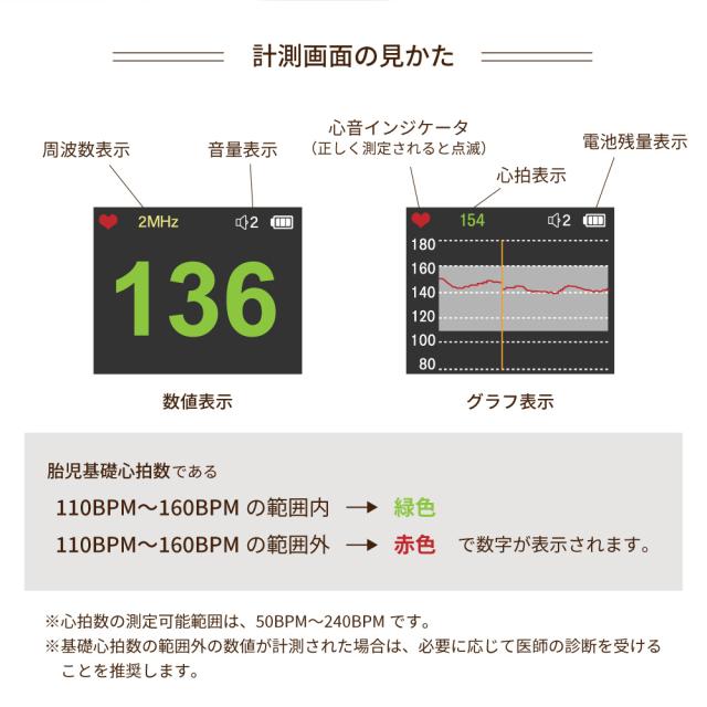 | 心音測定範囲 | 50BPM〜240BPM |